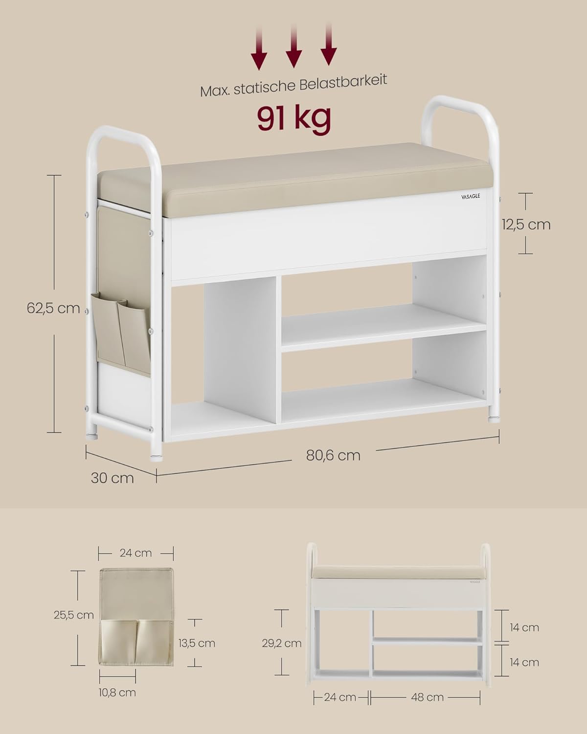 Denne opbevaringsbænk er udstyret med en 5 cm tyk, polstret PU-sædepude, der giver optimal siddekomfort. De solide 22 mm stålrammer og justerbare fødder sikrer stabilitet, selv på ujævne gulve, hvilket gør den til en sikker og robust løsning til dit hjem.