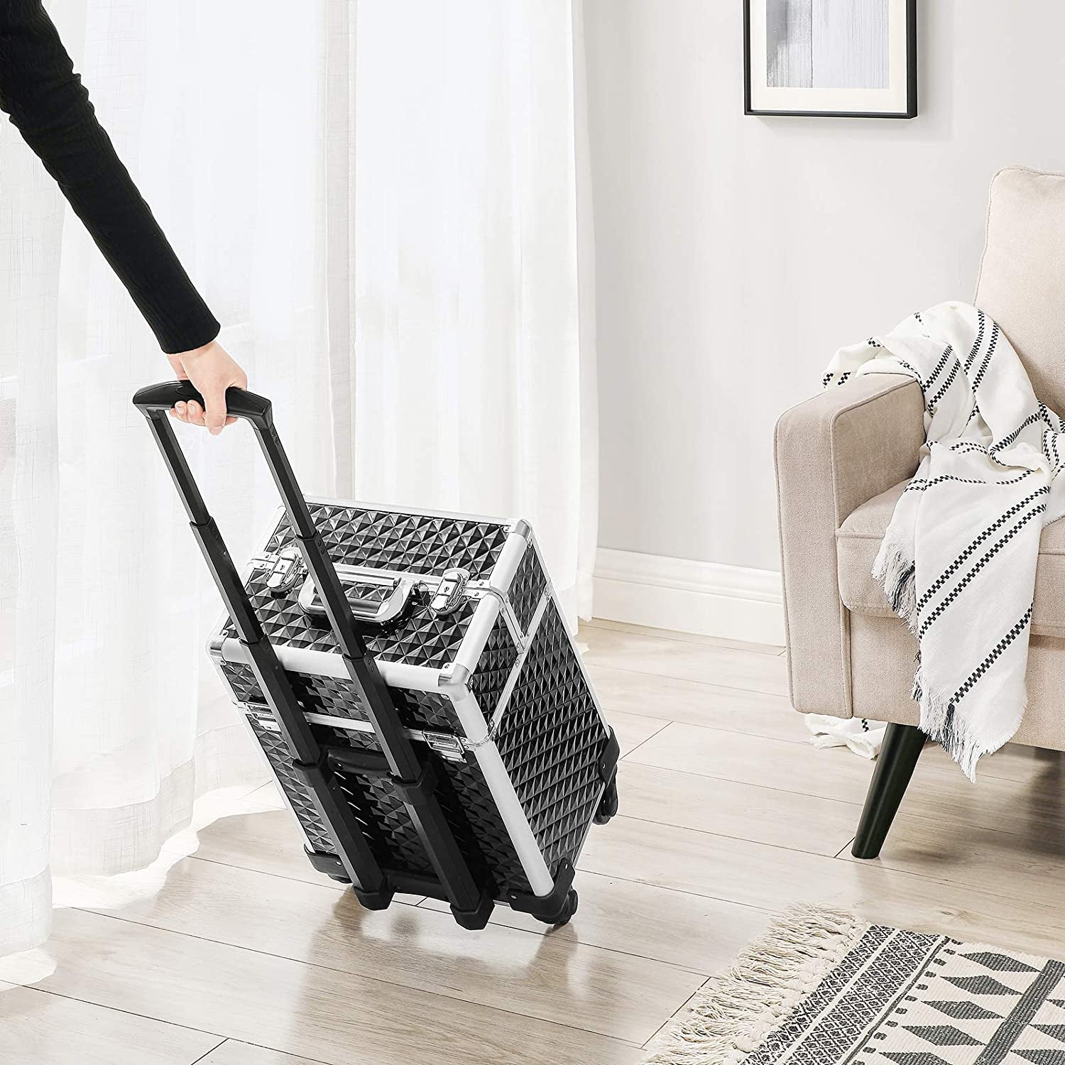 Med sin elegante sorte farve, skinnende metalhåndtag i sølv, blød velvet-foring, neat stitching og kvalitets PU-materiale, kombinerer dette smykkeskrin stil og holdbarhed. Det er stærkt nok til at rumme din voksende smykkesamling.