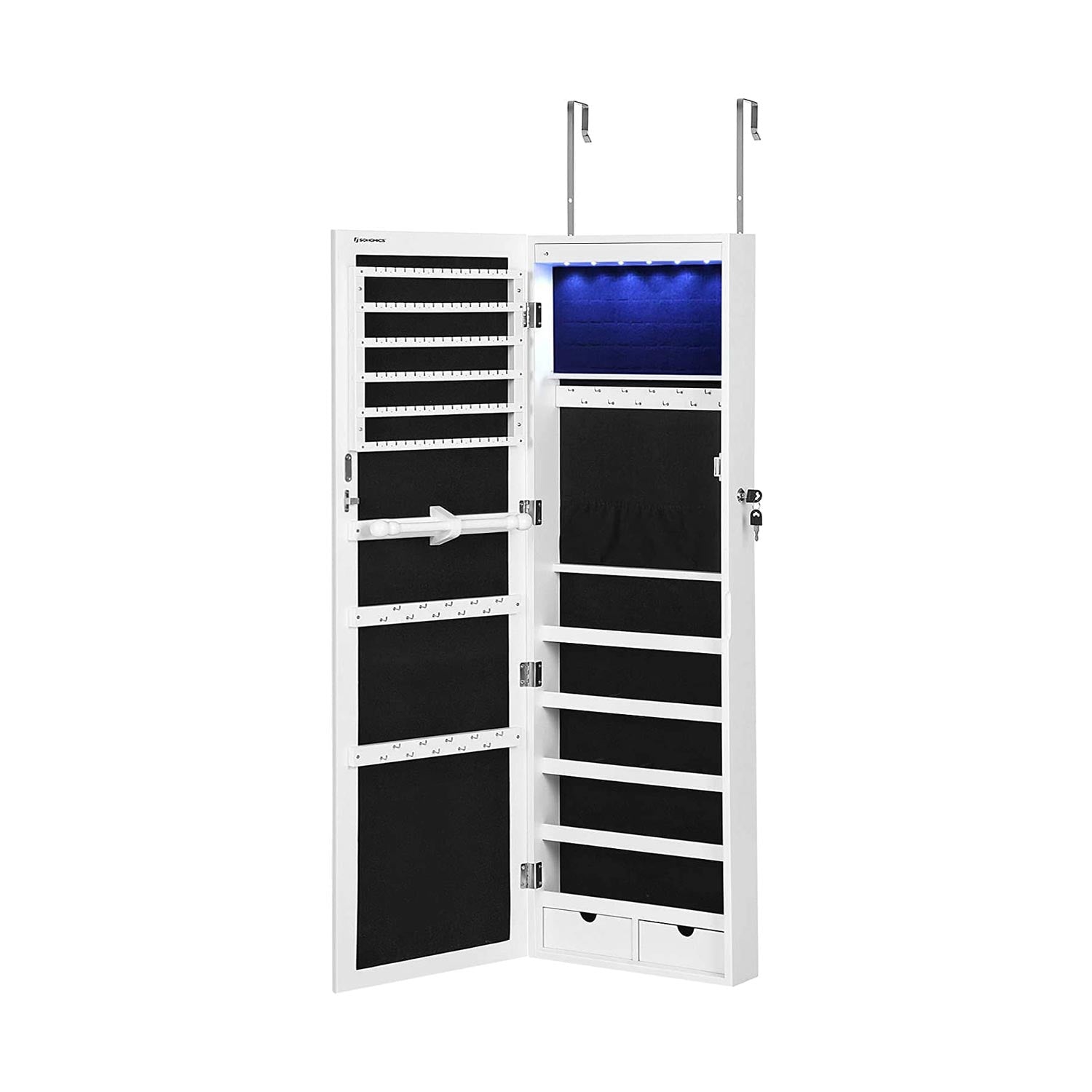 Leder du efter et elegant og sofistikeret møbel til at organisere dine dyrebare smykker? Linda smykkeskab er den perfekte tilføjelse til ethvert kvinde- eller pigesoveværelse. Dette smukke og unikke skab har et fantastisk spejl udformet med en tidløs silhuet. Når det åbnes, vil du være vidne til det ultimative skattekammer med masser af plads til øreringe, ringe og hårpynt, skuffer til parfume og kosmetik, batteridrevne LED-lys; alt sammen forberedt til at tage imod din elskede smykkesamling. Det vigtigste er, at skabet kan lukkes sikkert med magneter, der holder dørene fast lukket. Desuden kan dette skab blive en del af ethvert rum med sit praktiske design - du kan montere det på en væg eller hænge det på en dør.
