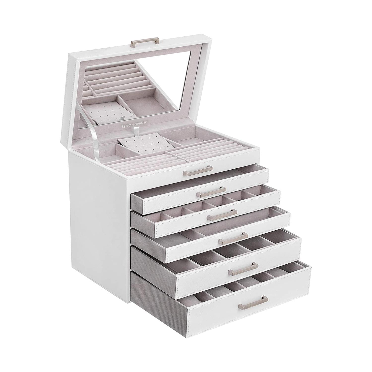 Elegant, moderne design - Vis din smag for smukke ting med denne stilfulde kasse. Med en hvid PU-overflade og skinnende metalhåndtag er den den perfekte tilføjelse til enhver boligindretning. Desuden kan du med det store spejl beundre din samling eller nemt prøve nye stykker derhjemme!
