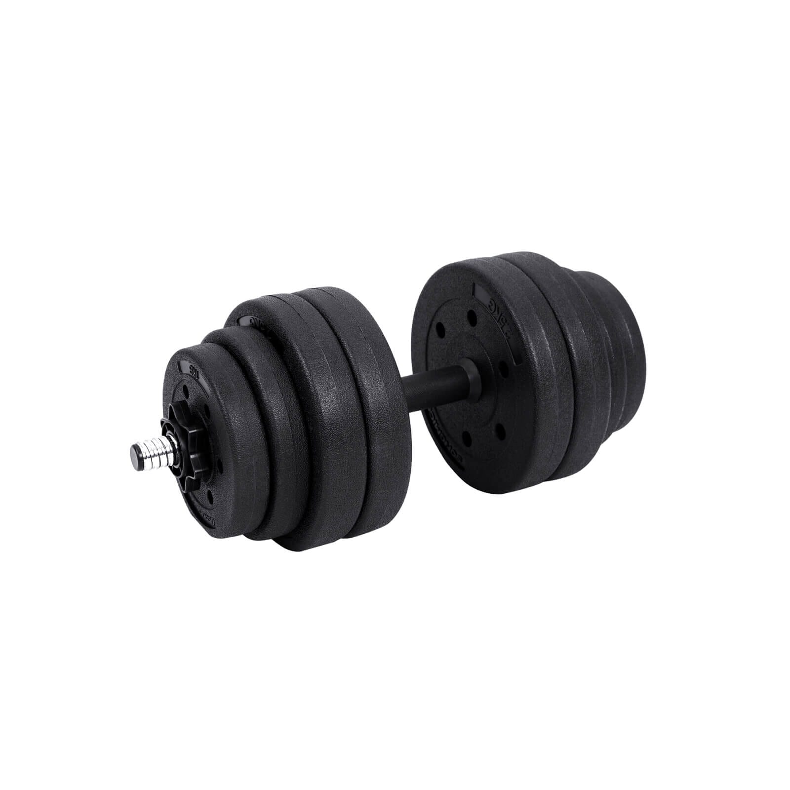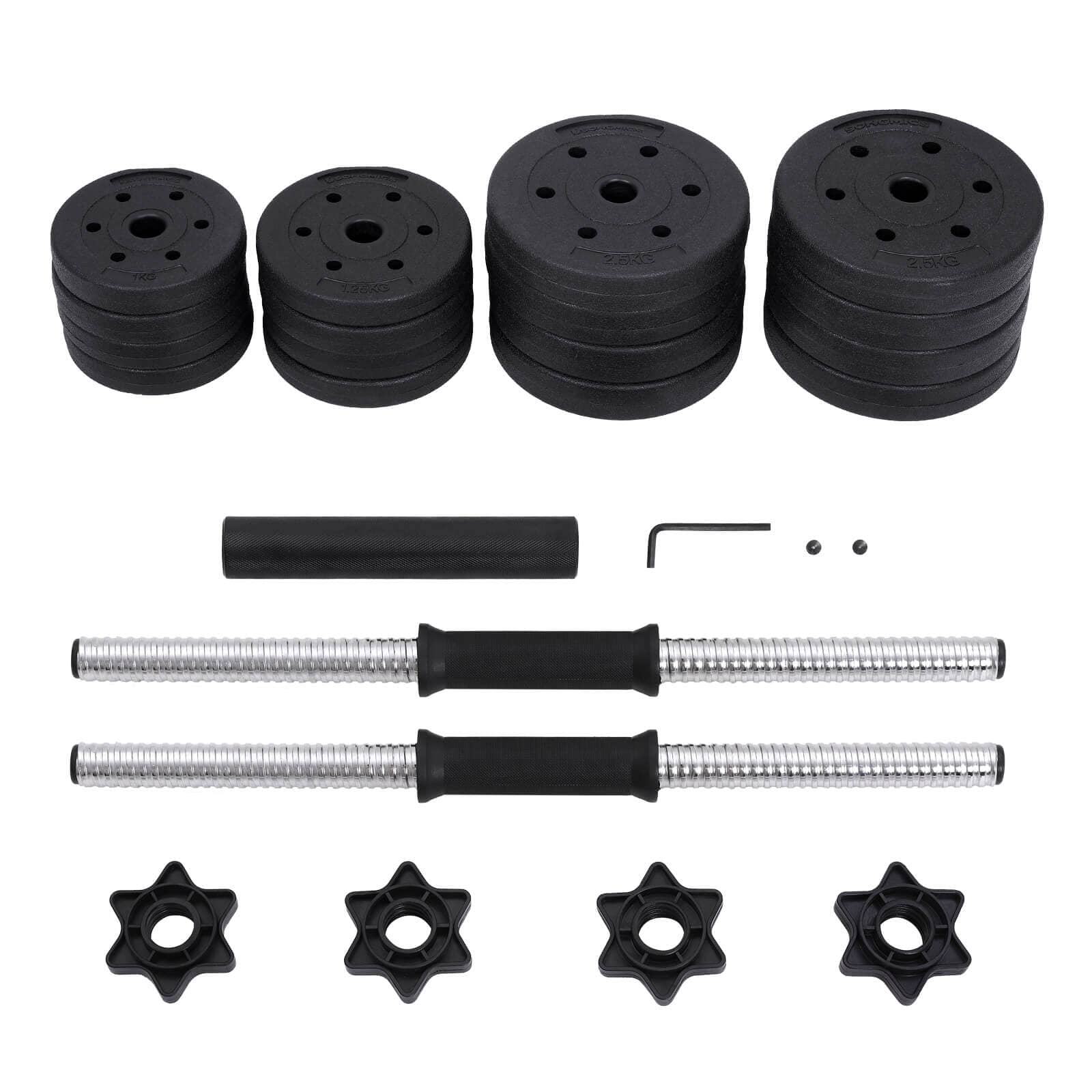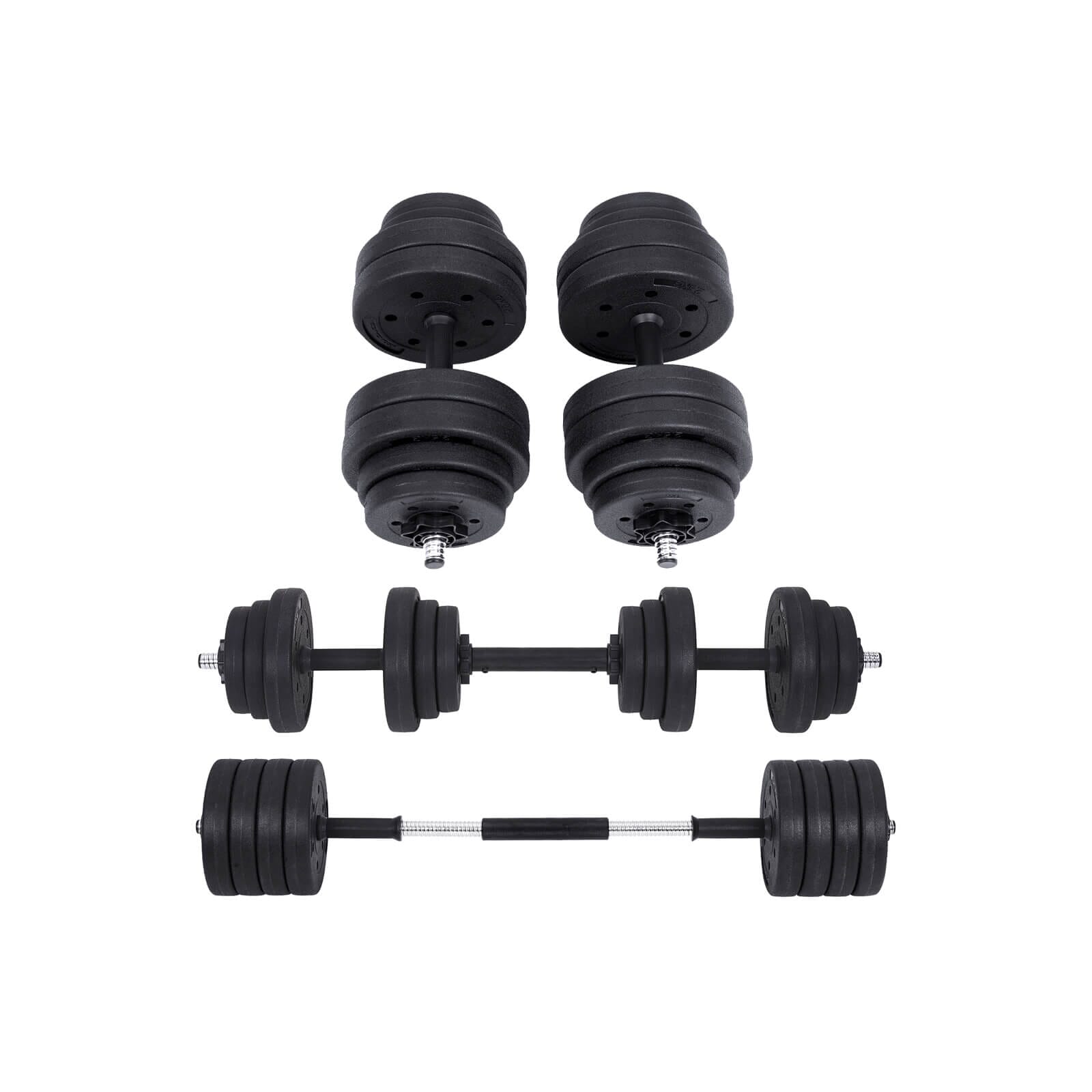 Fitness møder bekvemmelighed - Få din træning i gang i dit eget hjem eller på kontoret med dette omfattende fitness-sæt. Det indeholder 8 x 2,5 kg plader, 4 x 1,25 kg plader, 4 x 1 kg plader, 2 håndvægtsstænger, 4 spinlocks og en vægtstang, så du kan bruge 2x15 kg håndvægte eller 30 kg vægtstang.