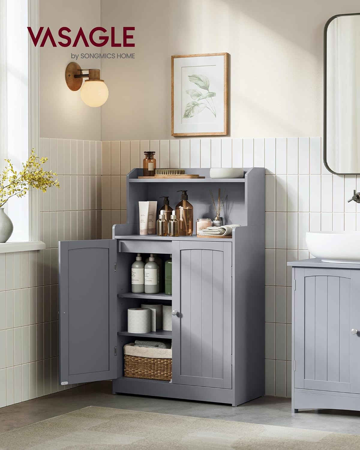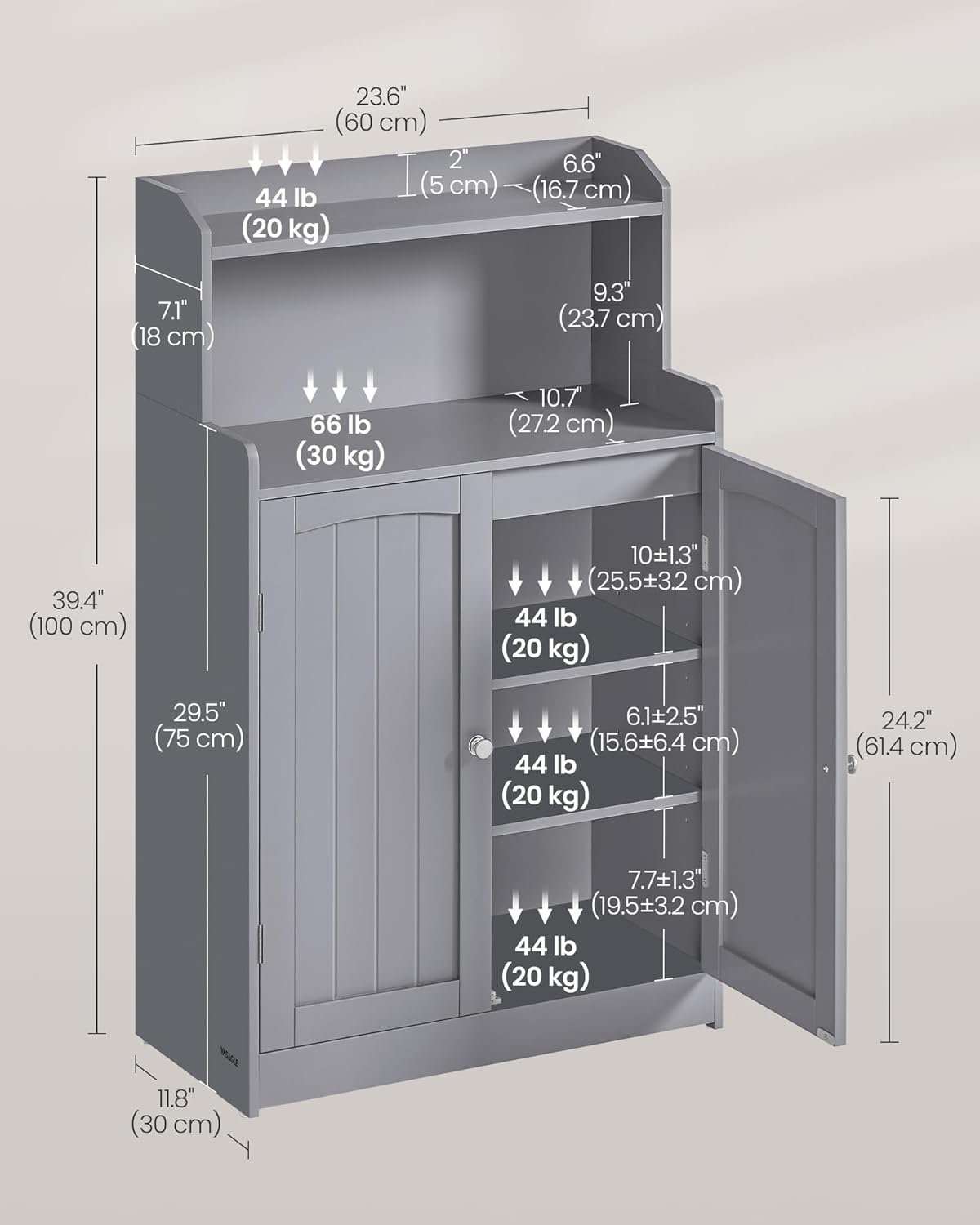 Med sin minimalistiske stil, rene linjer og dove-grå farve passer dette skab perfekt ind i både badeværelser, spisestuer og stuer. Det har opstående kanter på toppen for at forhindre ting i at falde ned, og anti-tip kittet sikrer stabilitet og sikkerhed i dit hjem.
