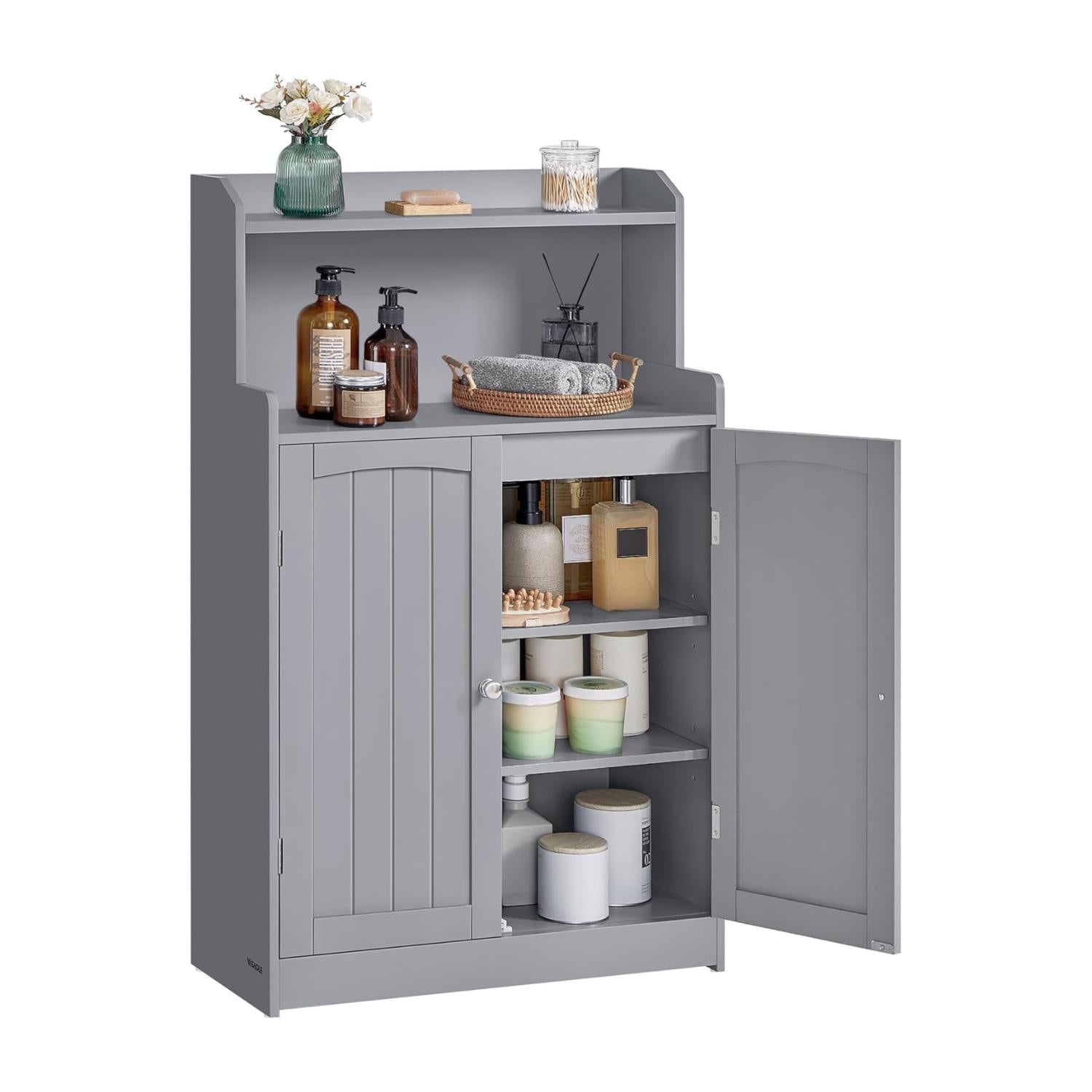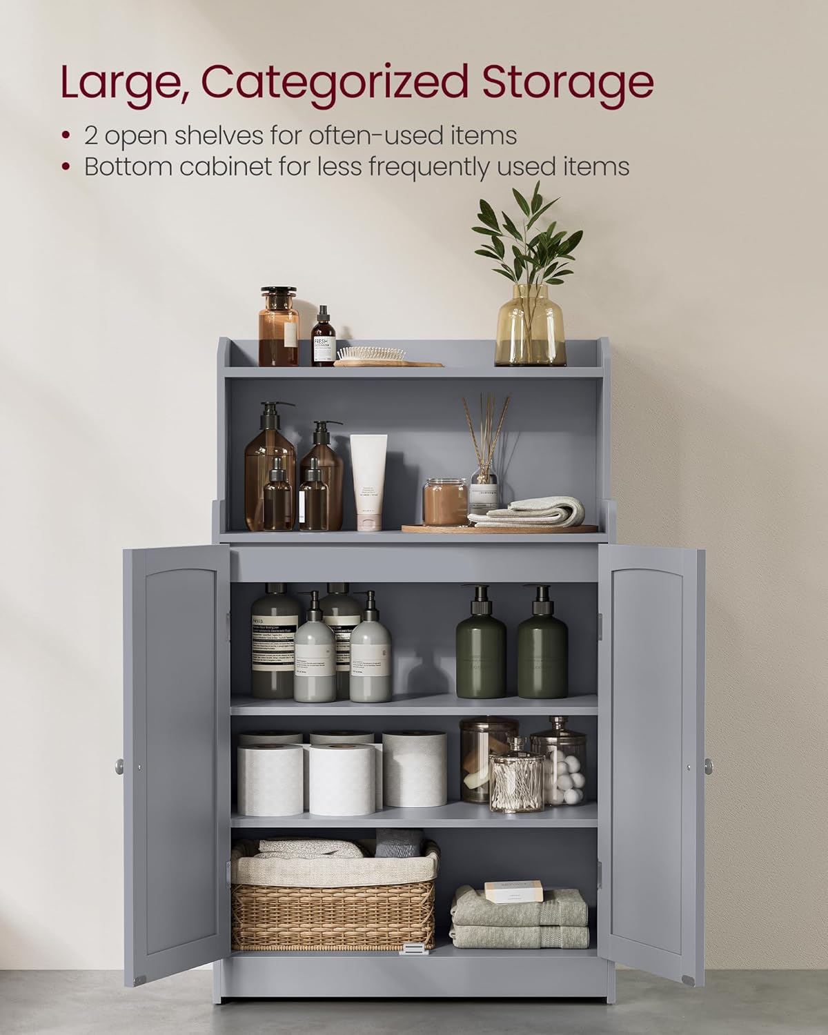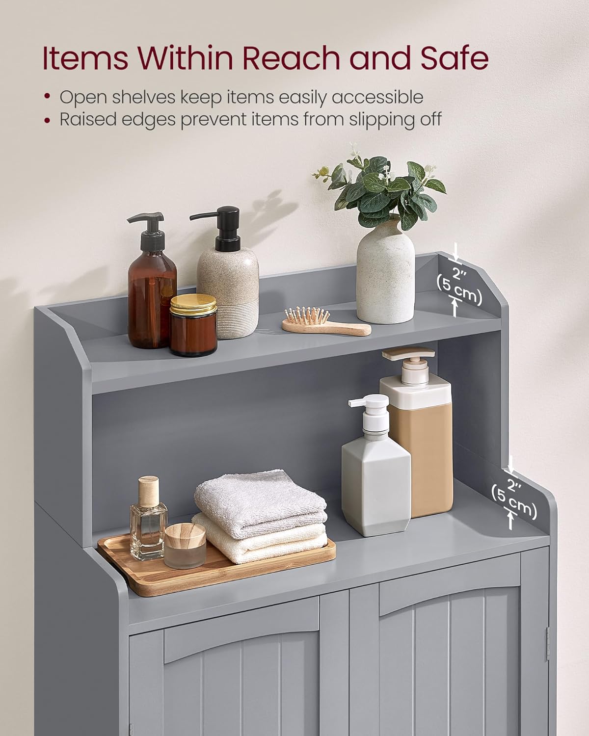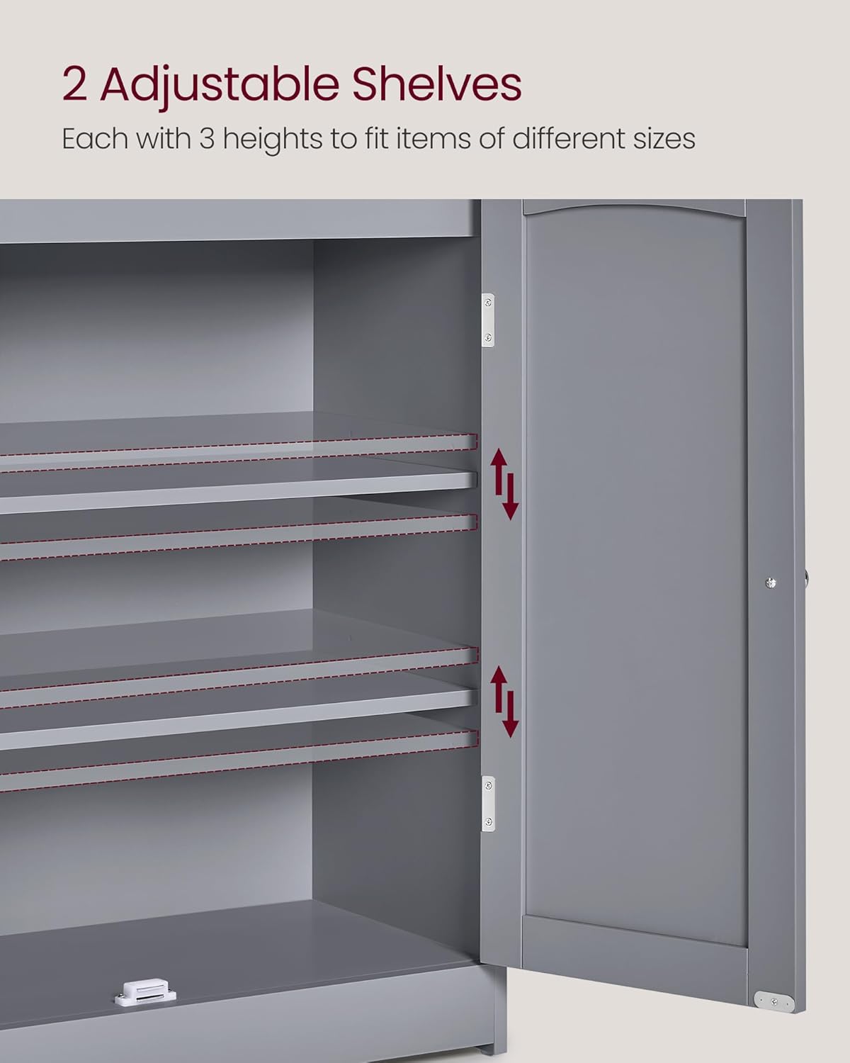 Bag de lukkede døre finder du to justerbare hylder med tre højdeindstillinger hver. De er ideelle til alt fra høje shampoo-flasker til sammenfoldede håndklæder og små beholdere, så du nemt kan tilpasse skabet til dine specifikke opbevaringsbehov.