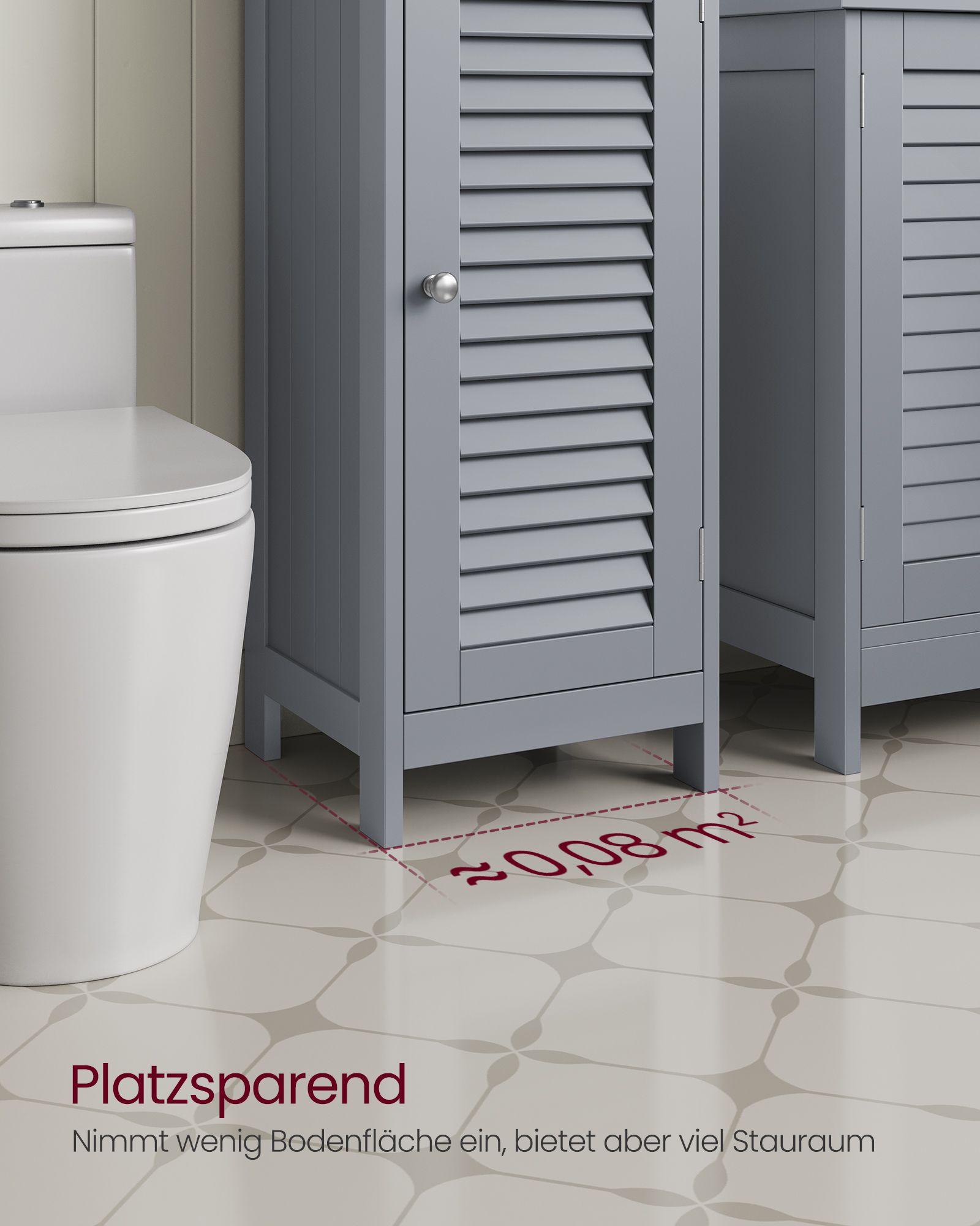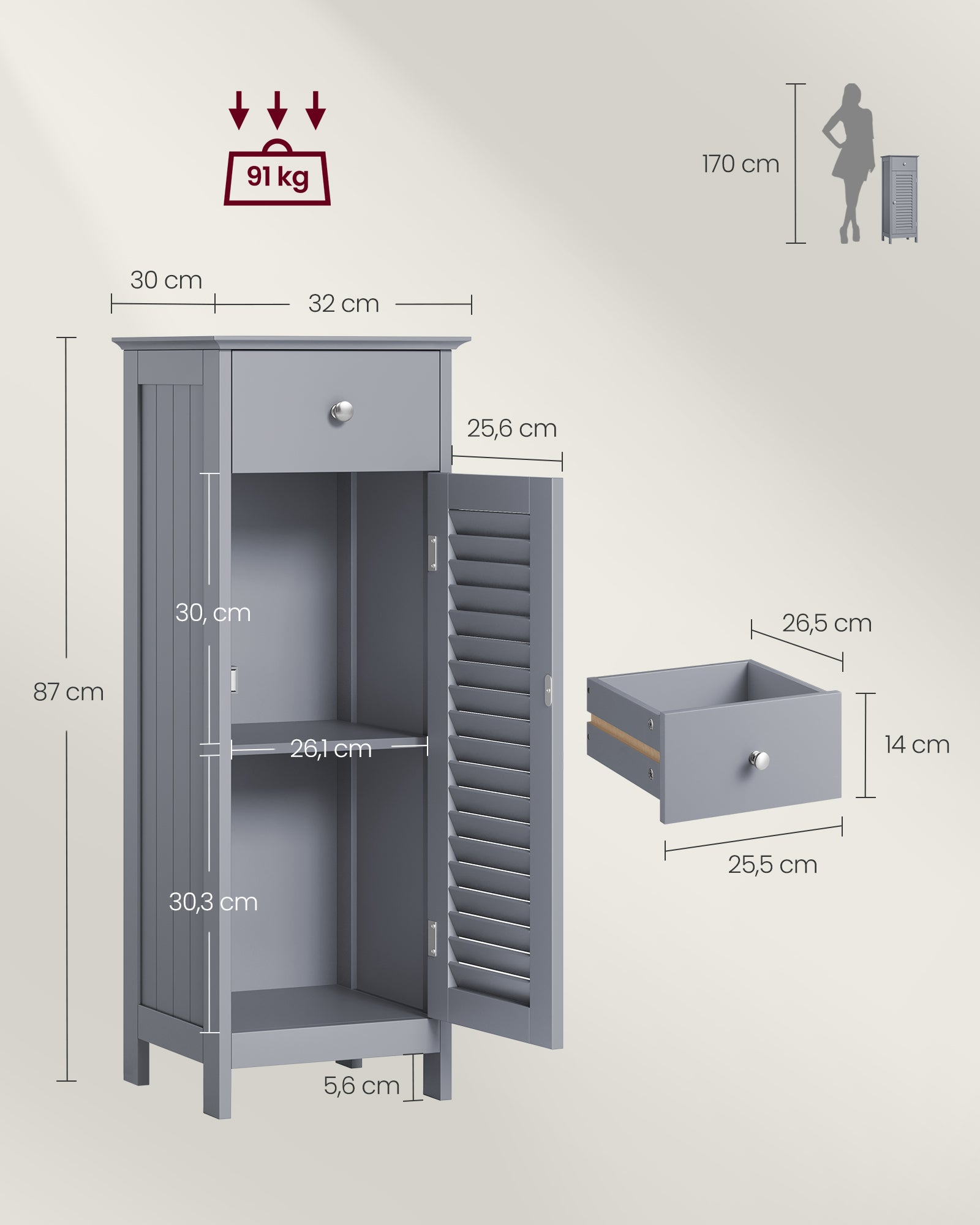 Dette praktiske opbevaringsmøbel er ideelt til mange rum, ikke kun badeværelset. Brug det i stuen til CD’er og fotoalbum, i spisestuen til glasvarer, eller i køkkenet til flasker og glas. Dets mystiske grå farve passer perfekt ind i forskellige indretningsstile og tilføjer et stilfuldt præg til dit hjem.