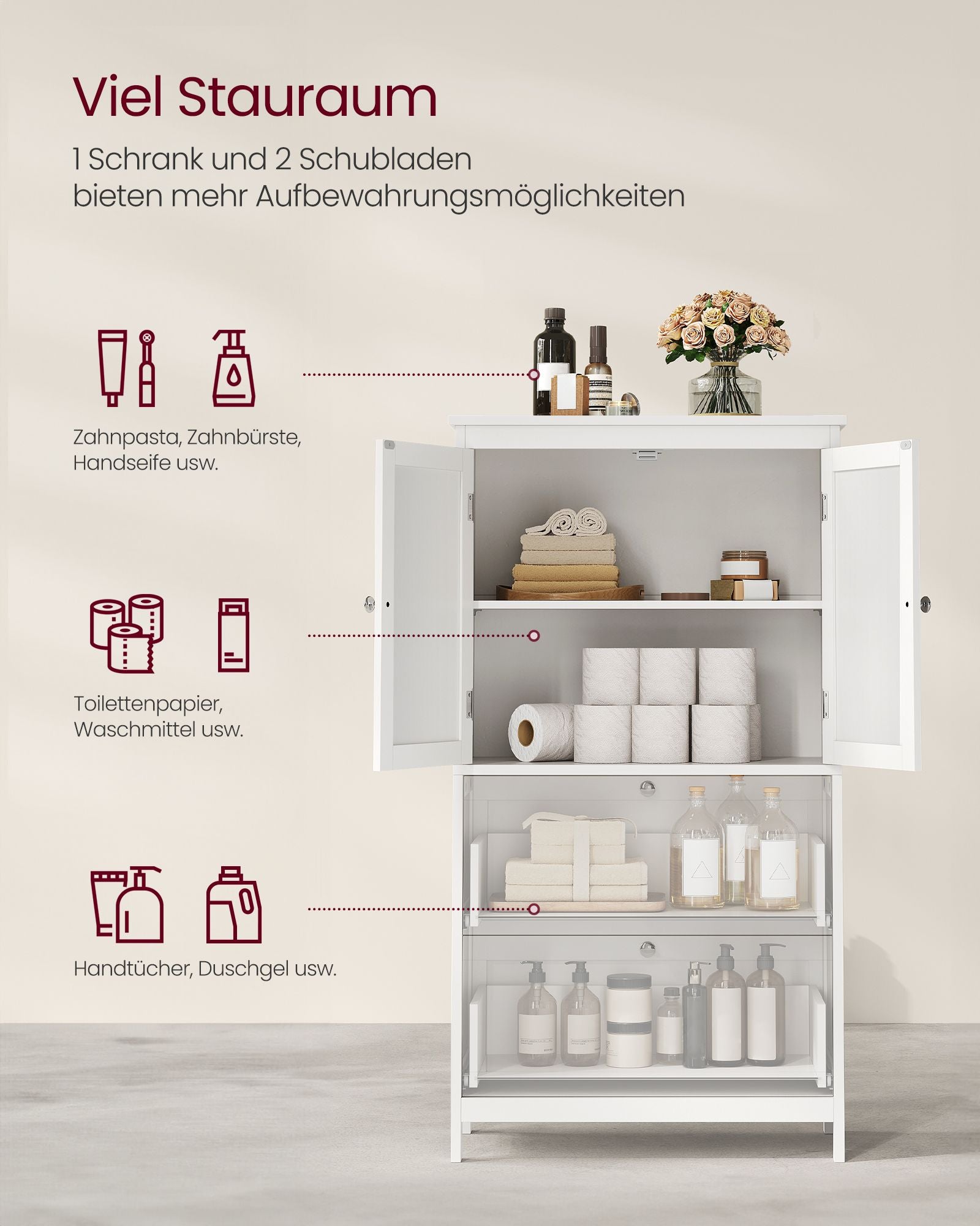 Denne badeværelsesskab tilbyder en generøs opbevaringsløsning med et rummeligt skab og to store skuffer. Du har masser af plads til at organisere dine daglige toiletartikler og ekstra genstande, hvilket gør det nemt at holde dit badeværelse ryddeligt og overskueligt. Uanset om det er håndklæder, kosmetik eller rengøringsmidler, giver denne enhed dig den nødvendige plads til at holde alting i perfekt orden.