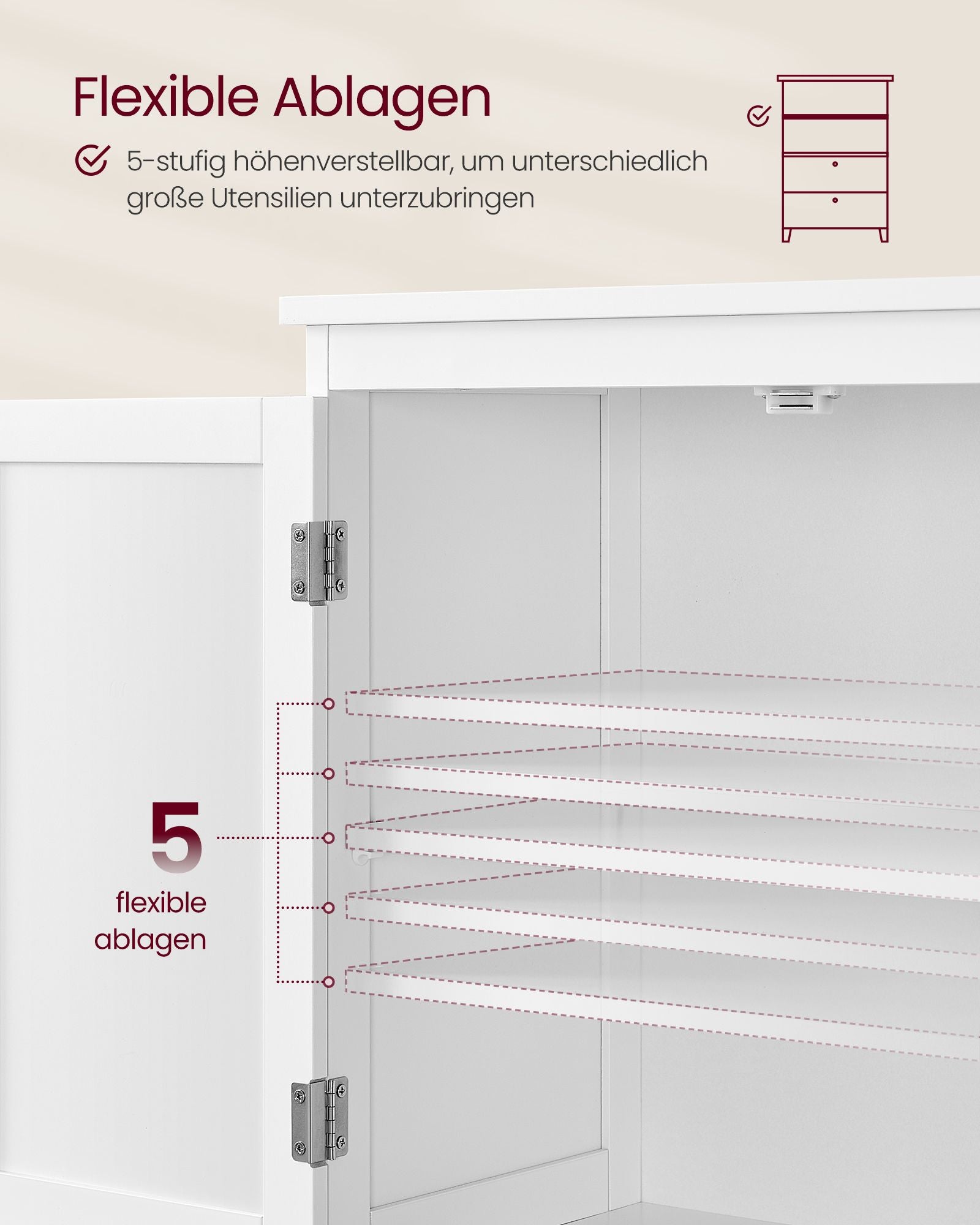Tilpas din opbevaringsplads uden besvær med de 5 justerbare hylder bag døren. Uanset om du har høje flasker eller små beholdere, kan du nemt justere hyldernes position for at rumme genstande i forskellige højder. Dette gør skabet yderst fleksibelt og tilpasseligt til dine personlige behov, hvilket giver dig maksimal kontrol over, hvordan du organiserer dit badeværelse.