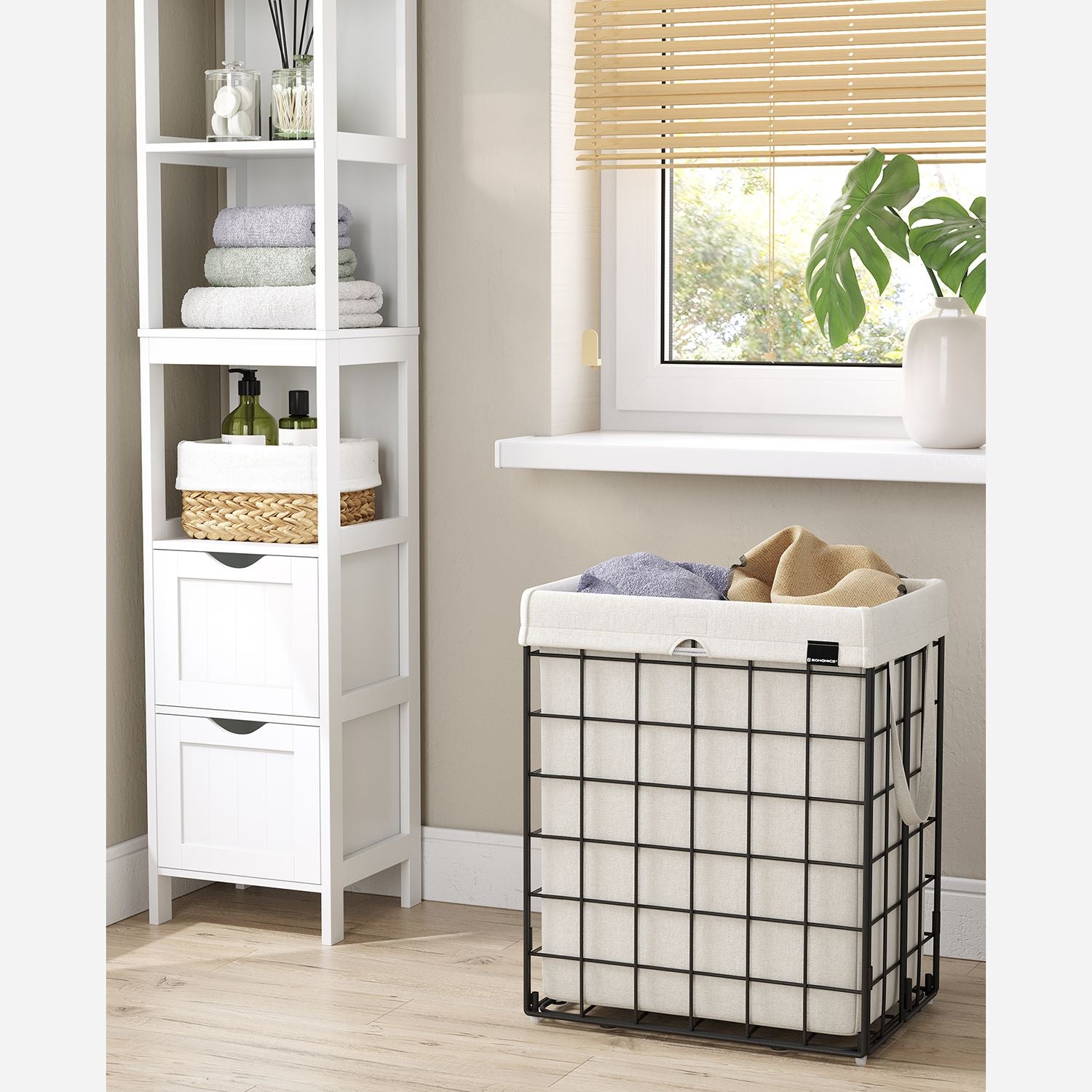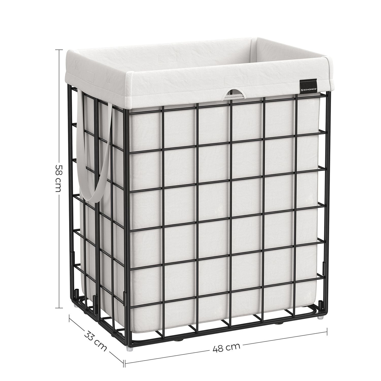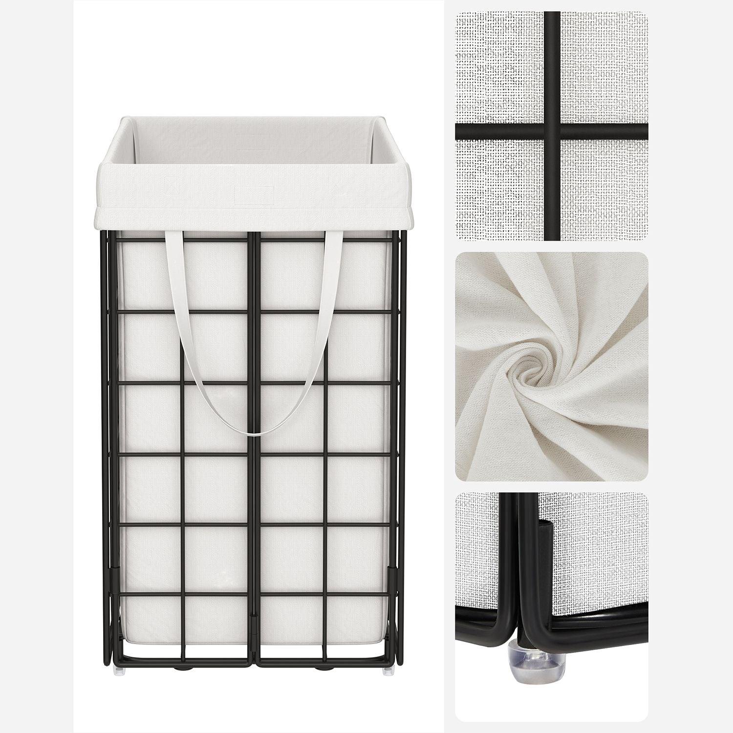 Denne vasketøjskurv er lavet af et 200 g/m² stof, der er ekstremt holdbart og kan bære op til 20 kg, mens trådkurven kan holde op til 30 kg. Fyller du den til randen med alt dit snavsetøj, kan du være sikker på, at den vil klare belastningen.