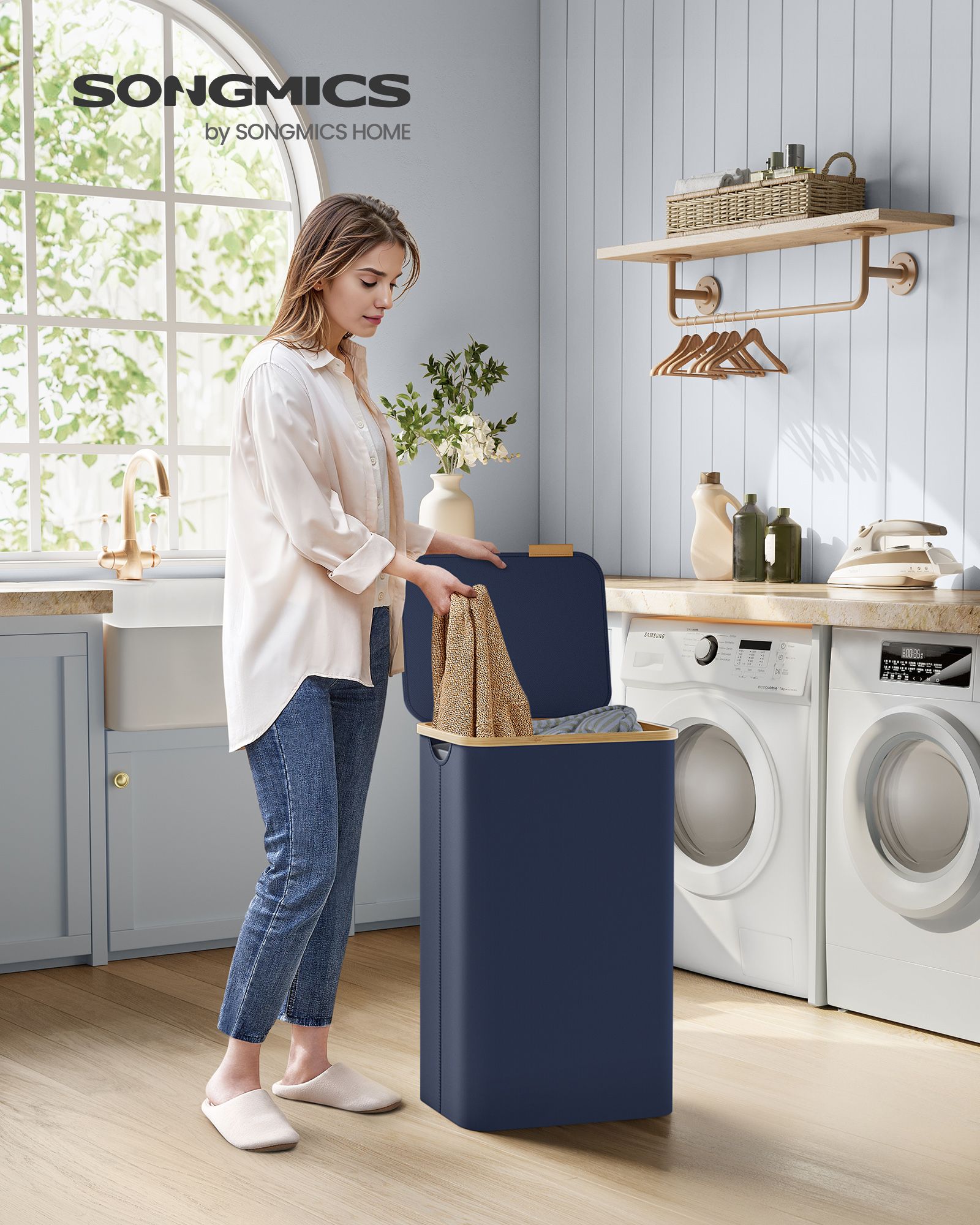 Vasketøjskurven har et låg, der holder støv væk og beskytter dit vasketøj. Det hjælper også med at skjule rodet, så dit rum ser pænt ud. Det faux læder logo på låget fungerer som håndtag til nem åbning og tilføjer et strejf af elegance til designet.