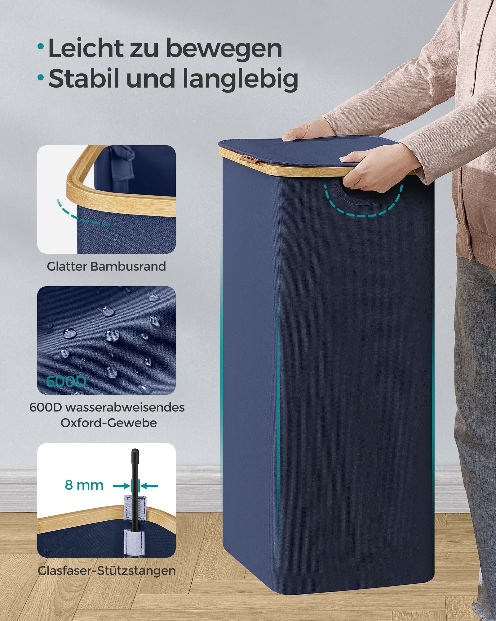 Fremstillet af 600D tykt Oxford-stof, er vasketøjskurven vandafvisende, rivbestandig og nem at rengøre. Den indre struktur understøttes af glasfiberstænger, hvilket sikrer stabilitet til daglig brug, så du kan stole på dens holdbarhed.