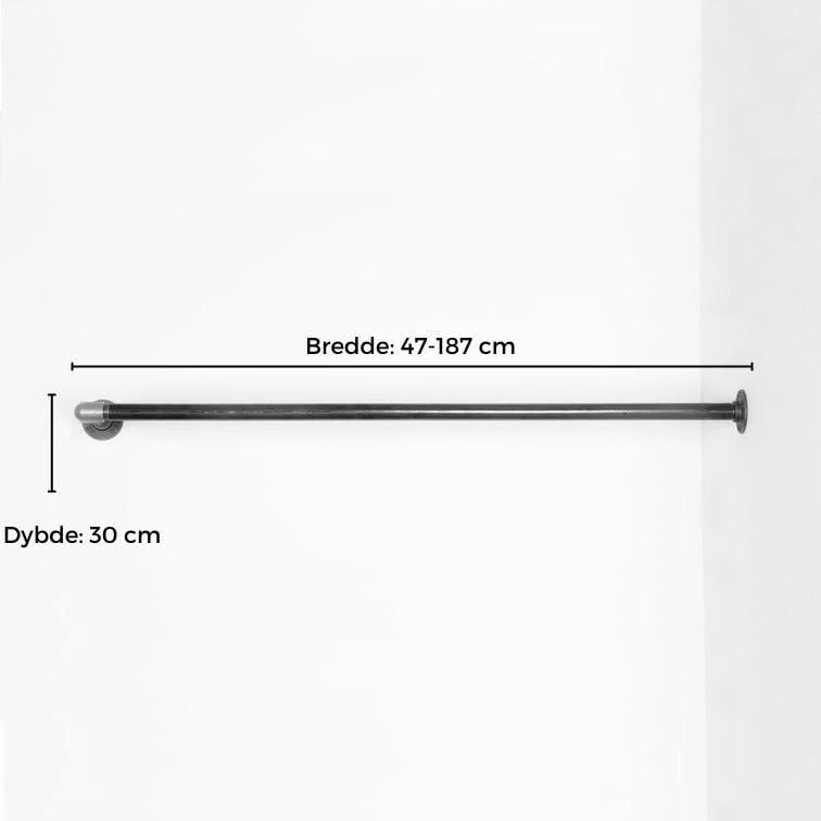 Bredde og dybde målet der er oplyst er de komplette bredde på hele ophænget fra ende til ende. Selve bøjlestangen er cirka 7 cm kortere end ophængets komplette bredde.