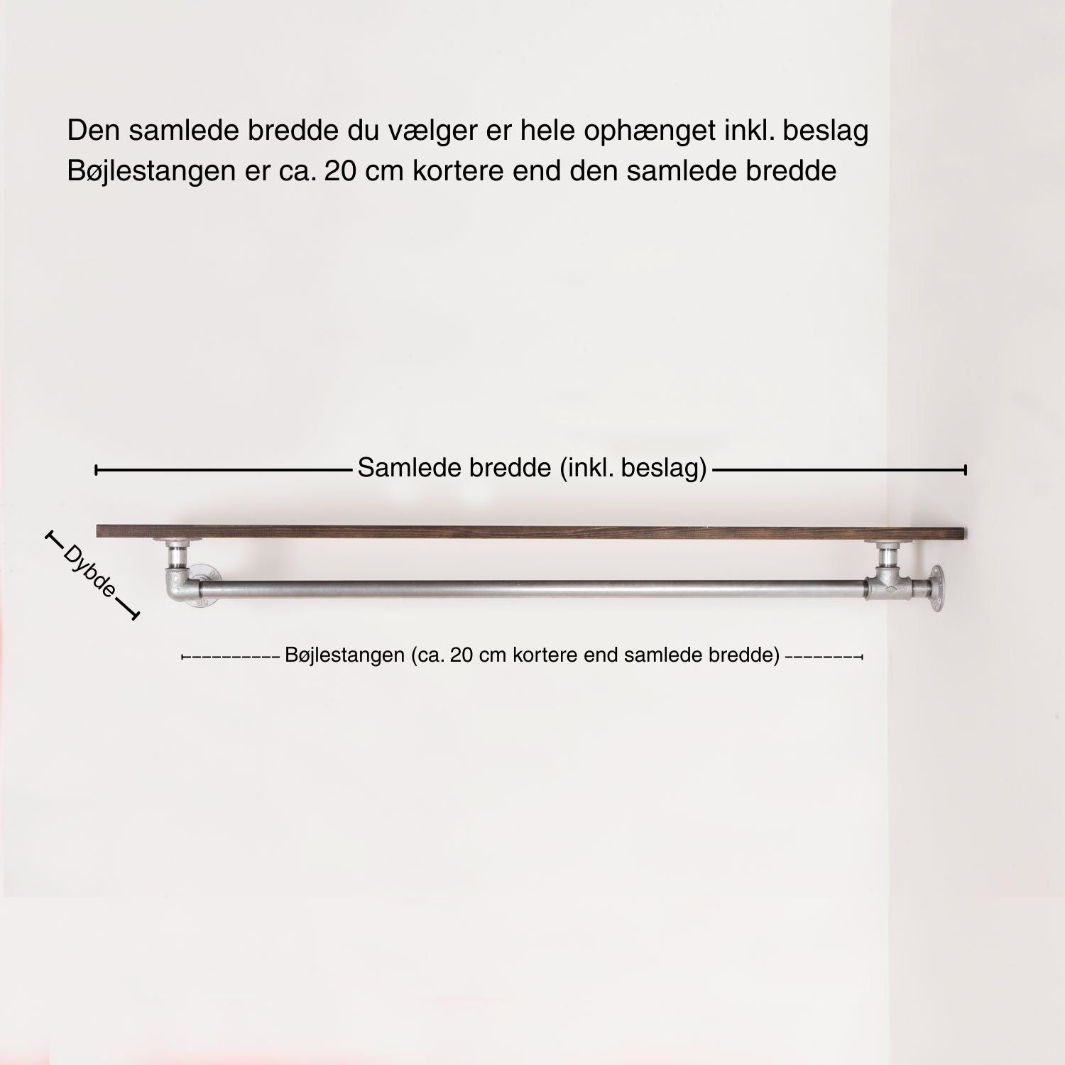 Lad os tage et eksempel: Vælger du bredden 120 cm. Så er hylden 120 cm. lang og selve bøjlestangen er 100 cm.