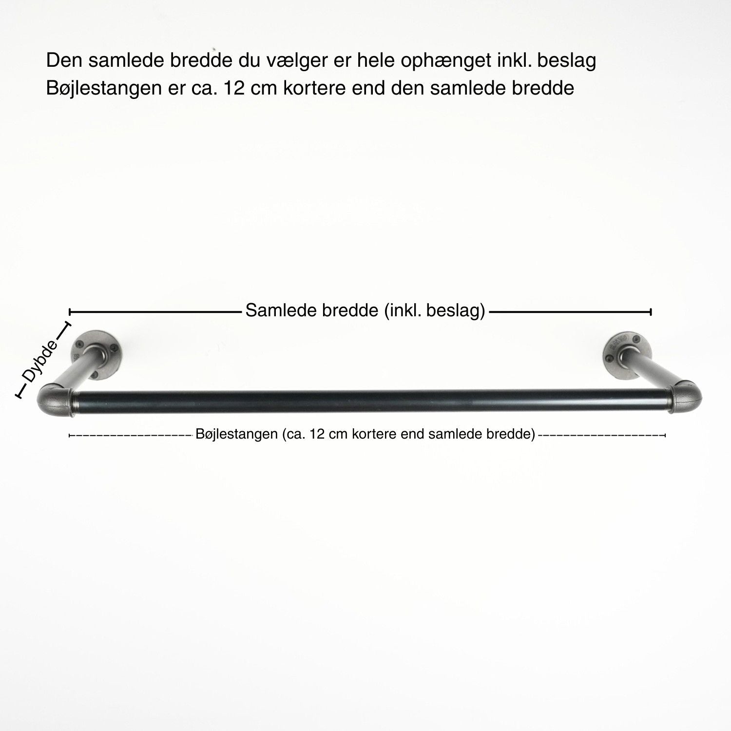 Bredde- og dybde målet der er oplyst er de samlede mål på hele ophænget fra ende til ende inkl. de runde beslag. Selve bøjlestangen er cirka 12 cm kortere end ophængets samlede bredde.