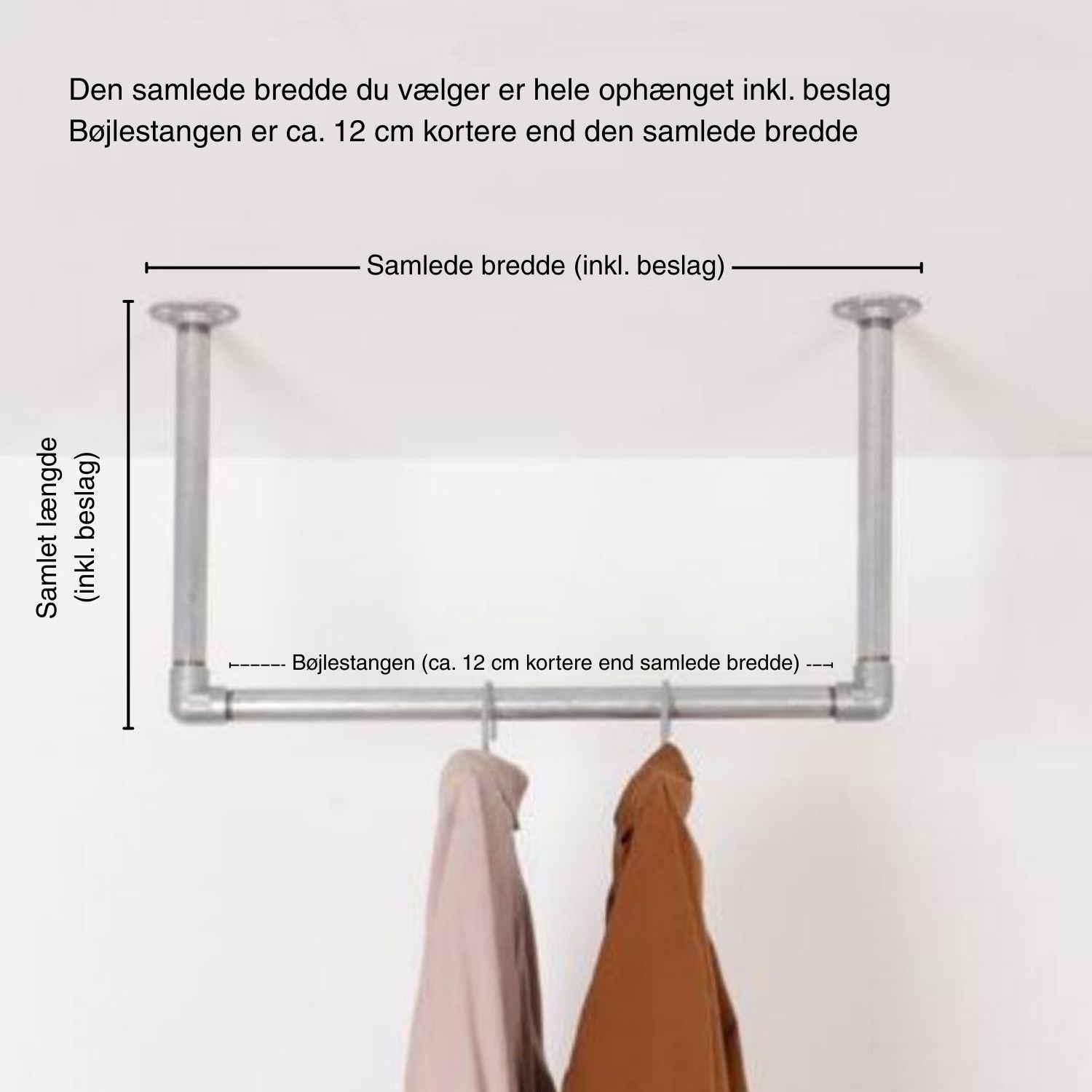 Bredde og dybde målet der er oplyst er de samlede mål på hele ophænget fra ende til ende inkl. de runde beslag. Selve bøjlestangen er cirka 12 cm kortere end ophængets samlet bredde.