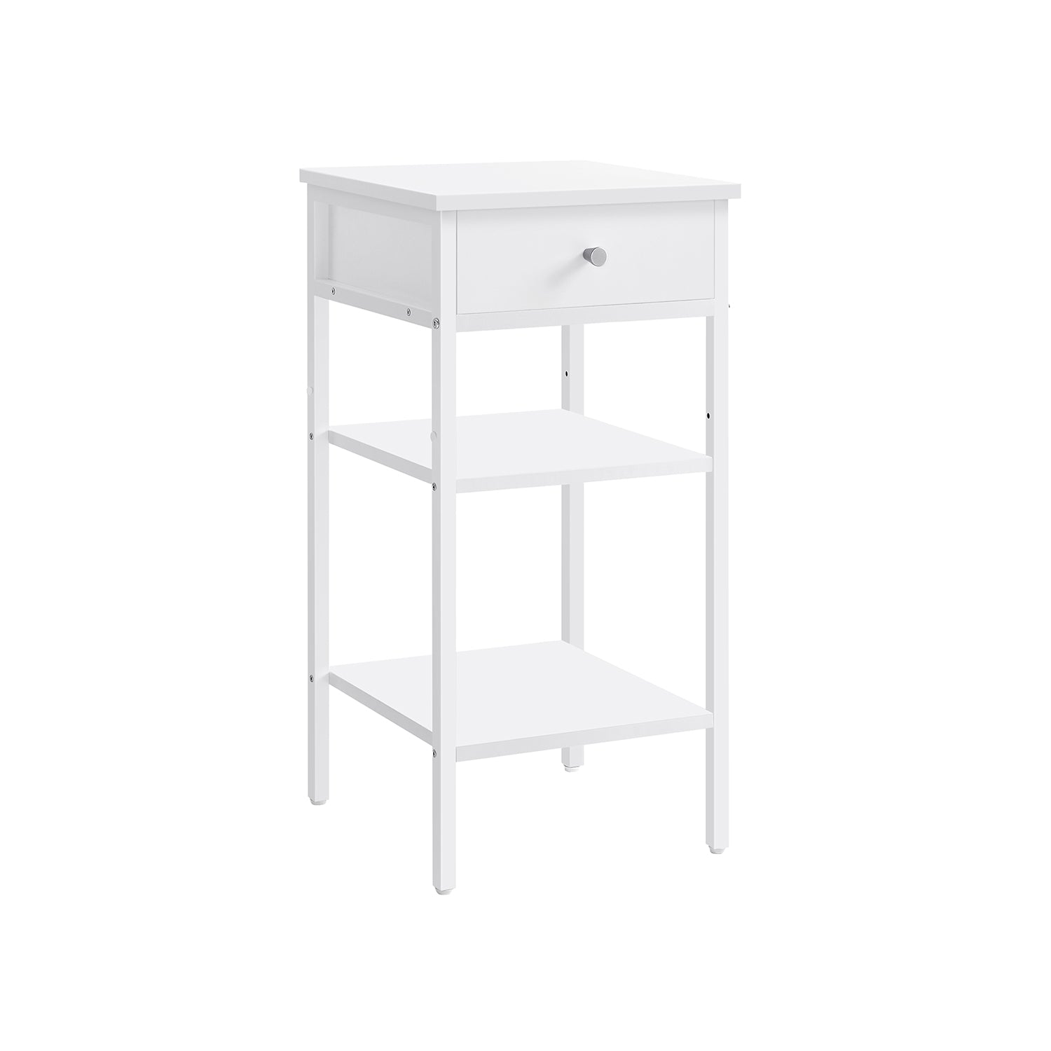 Dette slanke sidebord tilbyder tre opbevaringsmuligheder: en topplade, en skuffe og to åbne hylder. Brug den øverste overflade til at vise en lampe, dekorative genstande eller en bog, mens skuffen og hylderne giver plads til at gemme eller vise dine yndlingsartikler. Den robuste konstruktion sikrer, at du kan opbevare alle dine genstande sikkert.
