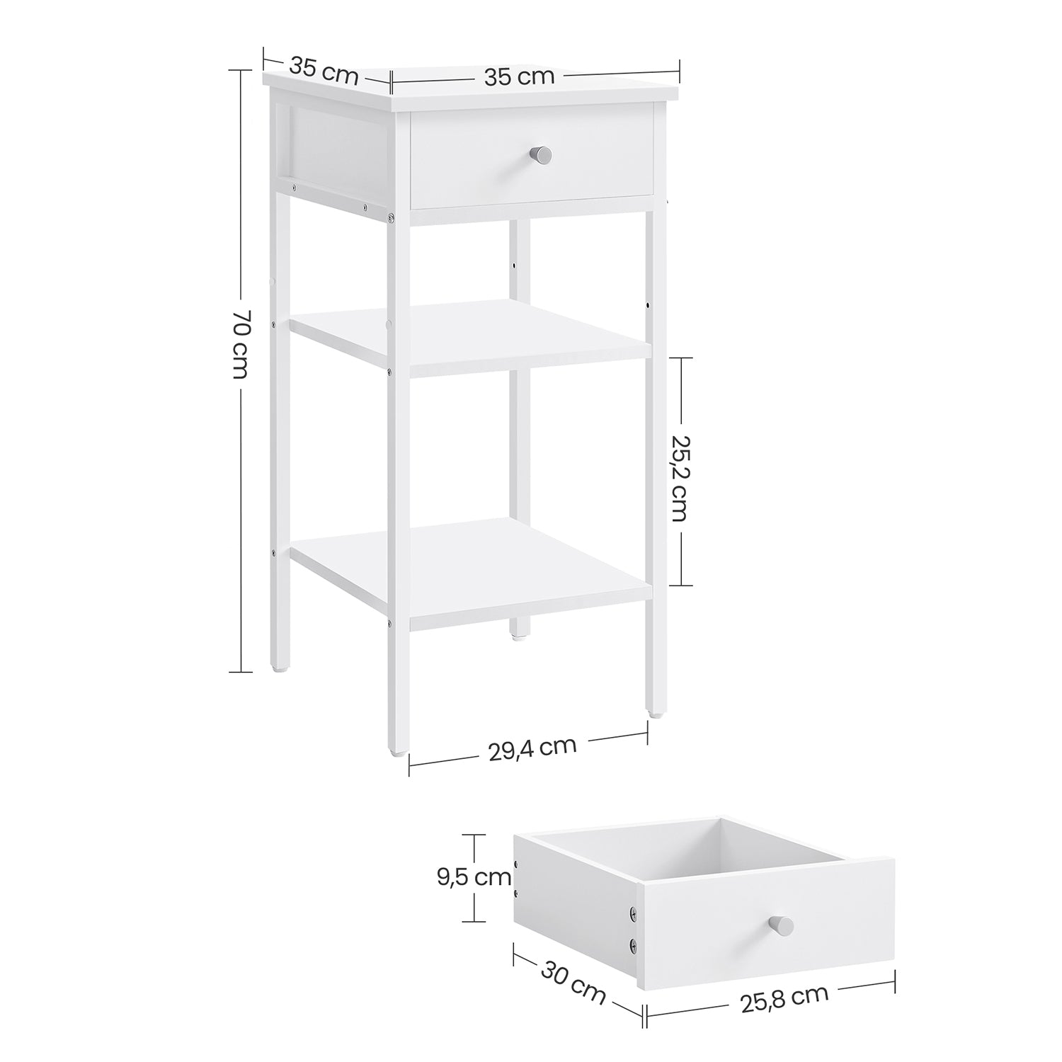 Med mål på 35 x 35 x 70 cm er dette høje natbord designet til at passe ind i små hjørner og stramme rum. Dets pladsbesparende design gør det ideelt til soveværelset, gangen eller stuen, hvor det diskret tilføjer funktionalitet uden at optage meget gulvplads. Det alsidige design sikrer, at du kan bruge det til en række forskellige formål i dit hjem.