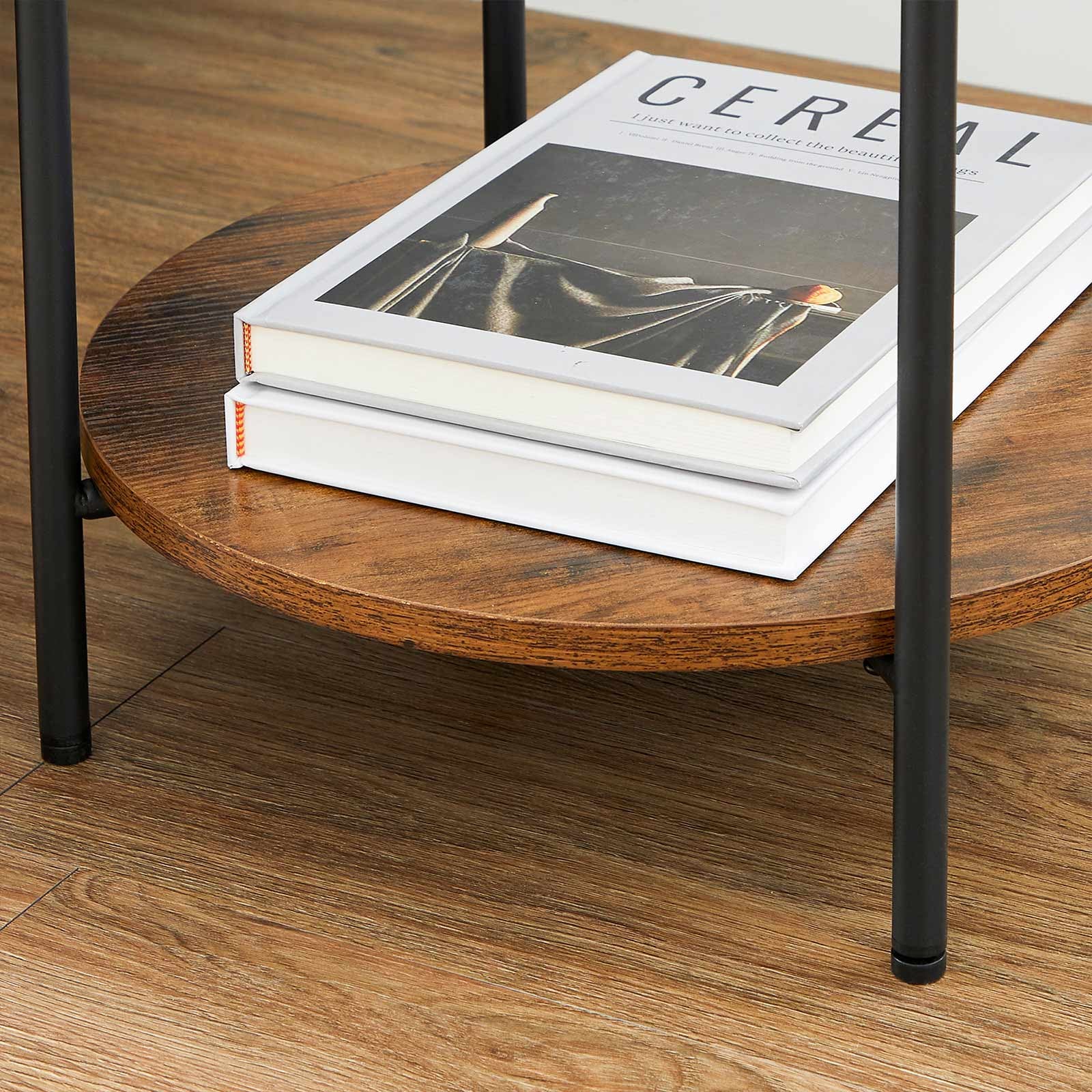 Oplev en kombination af elegance, enkelhed og kreativitet med dette stilfulde sidebord. Med en robust sort stålramme, en rund bakke øverst og en rustik brun hylde nederst, bringer dette bord både funktionalitet og skønhed ind i dit hjem. Perfekt til at opgradere din stue eller soveværelse med et strejf af moderne design, samtidig med at det tilbyder praktisk opbevaring.
