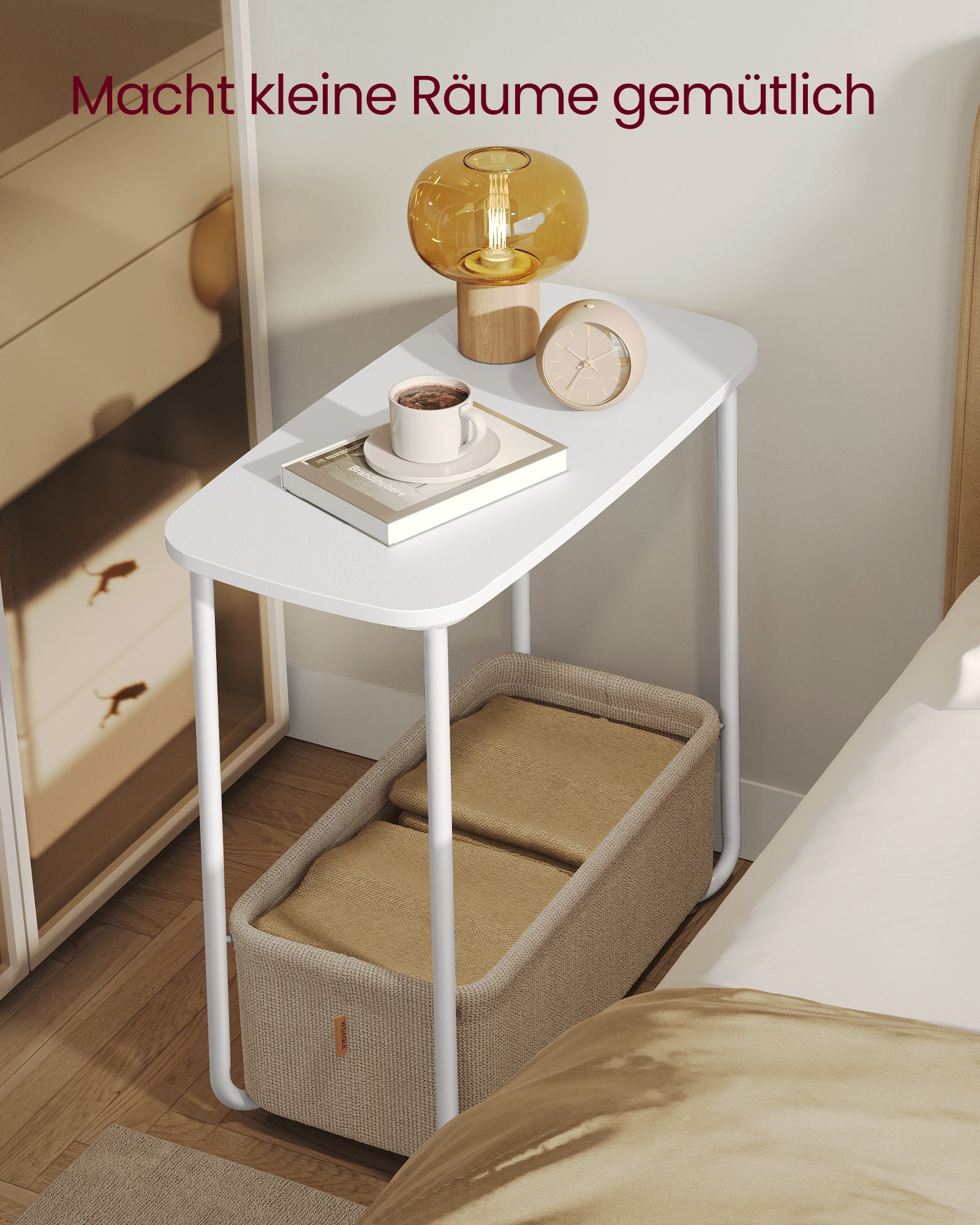 Hvis du kæmper med begrænset plads, er dette senge- og sidebord den ideelle løsning. Med sine kompakte dimensioner på 45 cm i diameter og 50 cm i højden passer det perfekt ind i små rum uden at fylde for meget. Bordet tilbyder samtidig rigelig opbevaring med en integreret stofkurv, der er perfekt til at gemme fjernbetjeninger, bøger eller andre småting. Uanset om du bruger det som natbord i soveværelset eller som sidebord i stuen, vil det maksimere din pladsudnyttelse.
