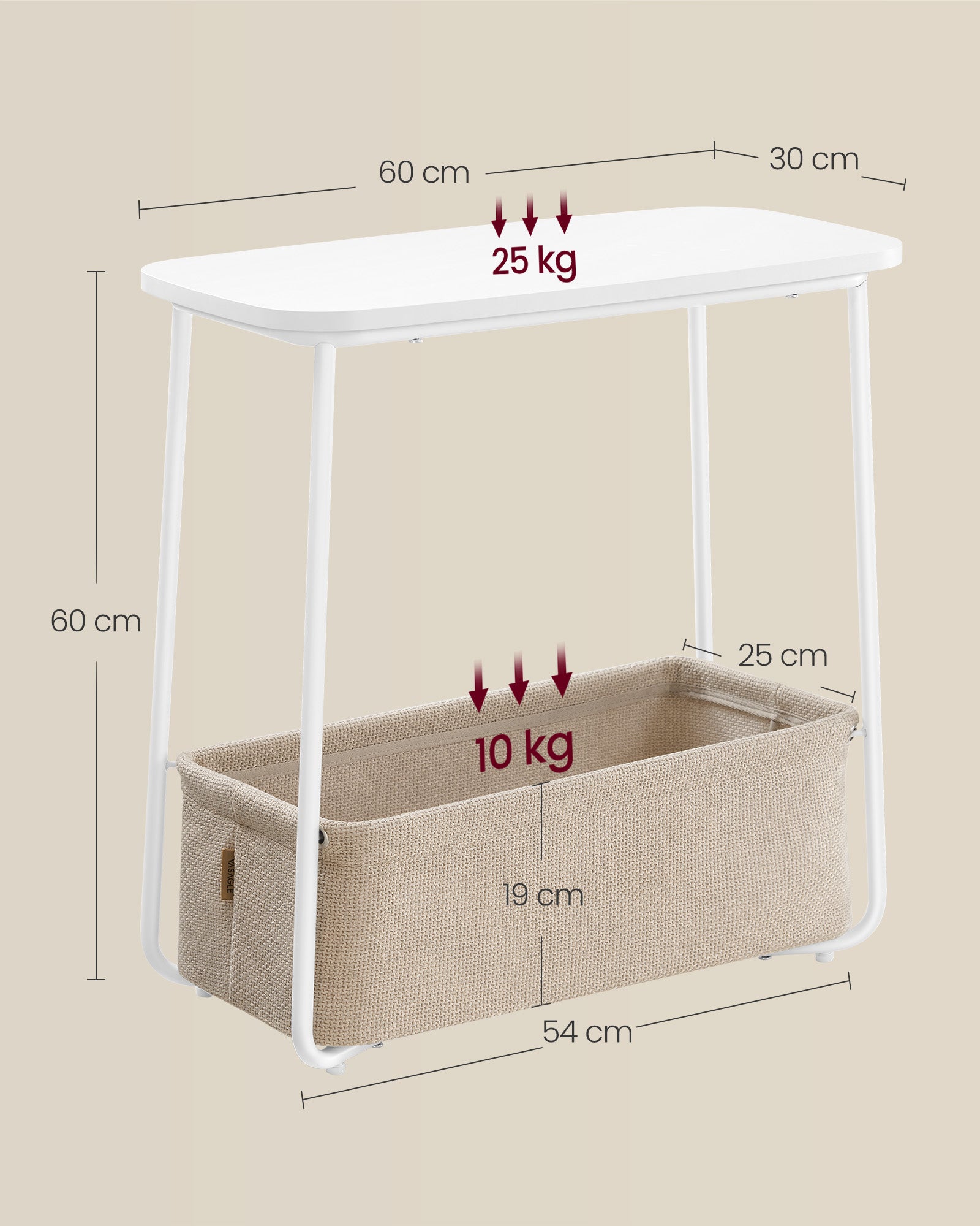 Dette senge- og sidebord kombinerer både stabilitet og æstetik. Bordpladen i spånplade er solidt fastgjort til rammen, hvilket sikrer, at bordet ikke vakler. De U-formede stålben giver en solid støtte, og de justerbare fødder sørger for, at bordet står stabilt uden at ridse gulvet. Den moderne, matte hvide finish kombineret med den camelbrune stofkurv giver bordet et elegant og tidløst udseende, der let matcher forskellige møbelstilarter.