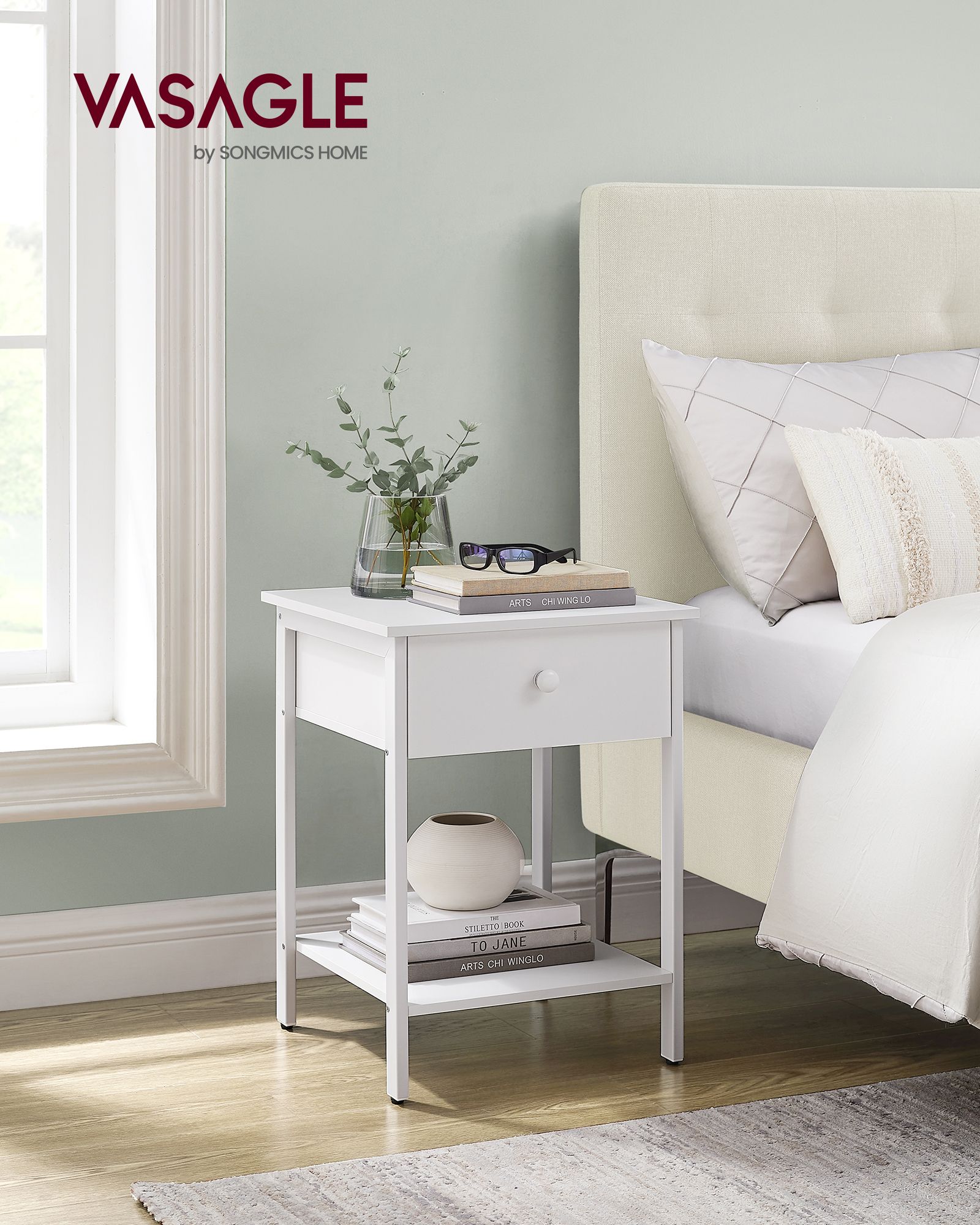 Dette senge- og sidebord i mat hvid og stålramme tilføjer et stilrent, moderne udtryk til dit hjem. Passer perfekt som natbord, sofabord eller ekstra opbevaringsbord.