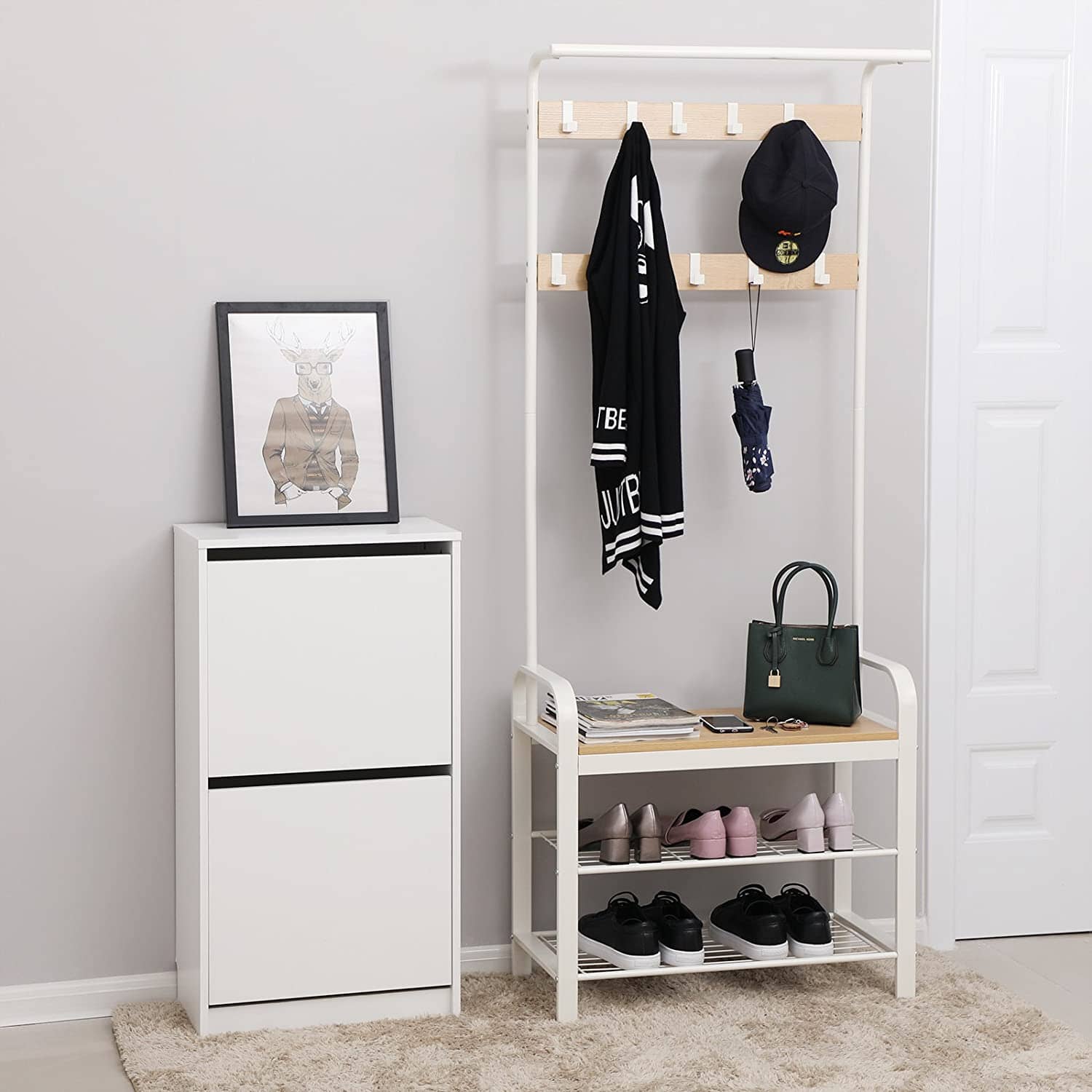 Phillip garderobestativet er en stabil og urban løsning til både lejligheder og huse. Hver krog kan bære op til 3 kg, mens hylden kan bære op til 80 kg - perfekt til opbevaring af frakker, hatte, sko og andre ting.