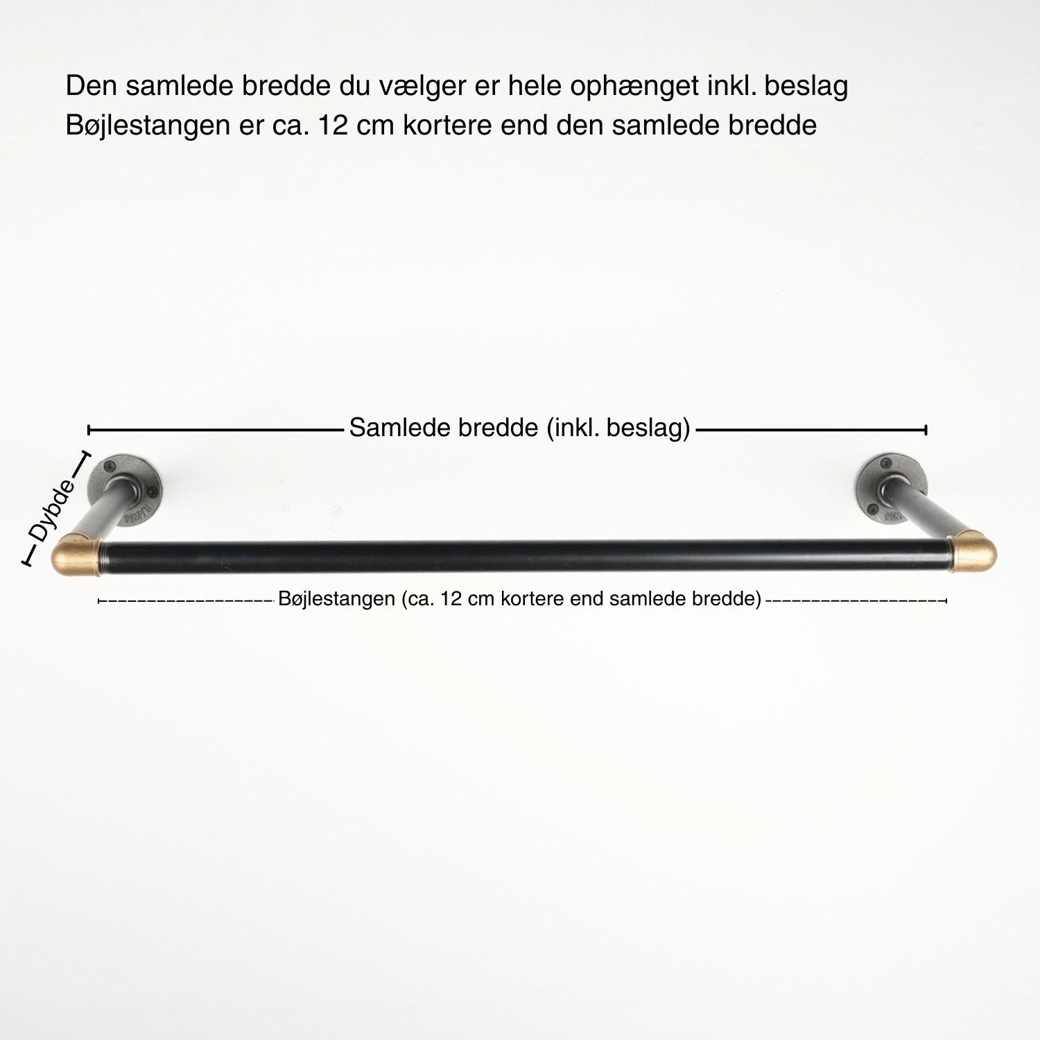 Bredde og dybde målet der er oplyst er de komplette mål på hele ophænget fra ende til ende inkl. de runde beslag. Selve bøjlestangen er cirka 12 cm kortere end ophængets komplette bredde.
