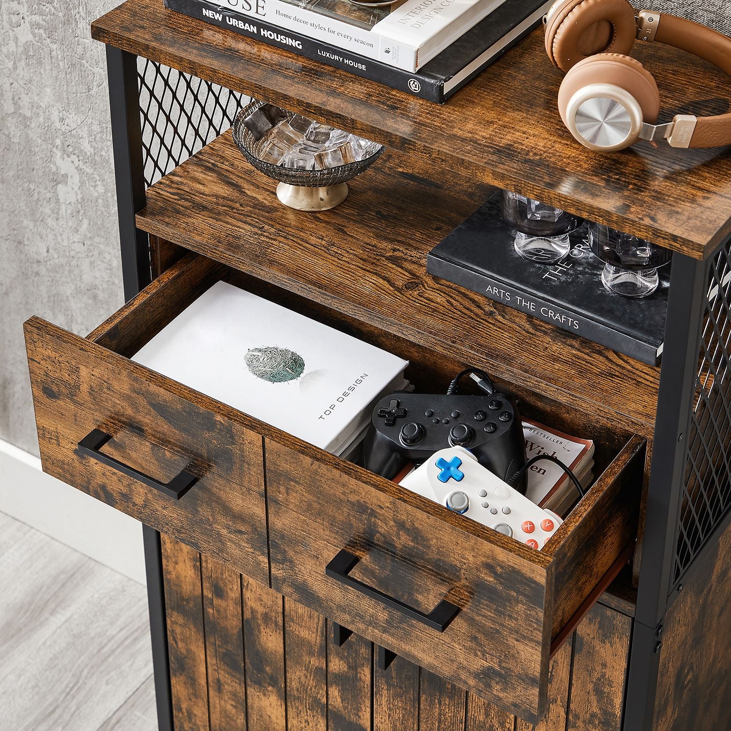 Skab en elegant atmosfære i dit hjem med dette rustikke skab, der kombinerer brune paneler med sort stål og et luftigt gitterdesign. De slattedøre tilføjer en autentisk charme, der vil berige ethvert rum – uanset om det er stuen, badeværelset eller køkkenet. Dette skab er den perfekte løsning til dem, der ønsker at tilføje en sofistikeret og funktionel opbevaringsløsning til deres indretning.