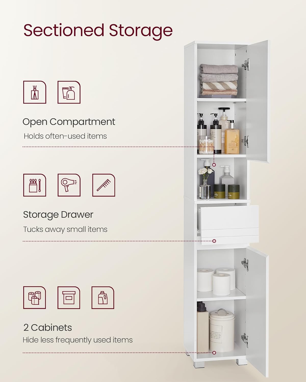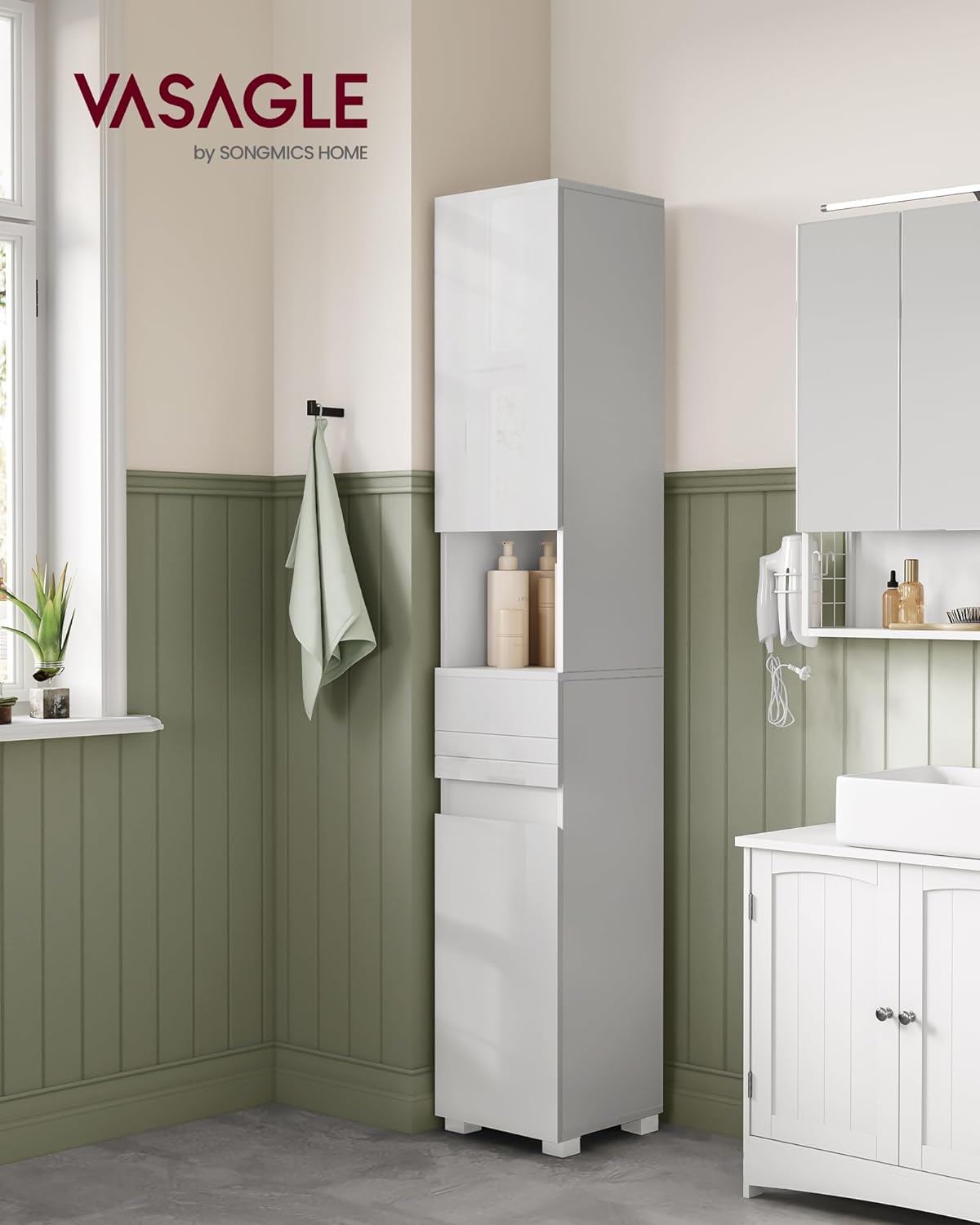 Vores slanke badeværelsesskab byder på både øvre og nedre skabe, hylder og skuffer, hvilket giver tre typer af opbevaringsløsninger fordelt på seks rum, så du kan opbevare dine ting sorteret efter type.