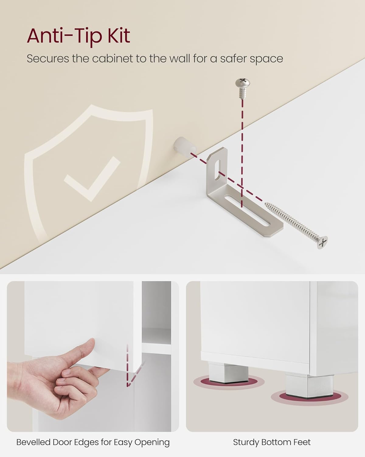Lavet af højkvalitets MDF, er dette smalle opbevaringsskab bygget til at holde. Et anti-tip kit medfølger for yderligere at forbedre den samlede stabilitet og sikkerhed.