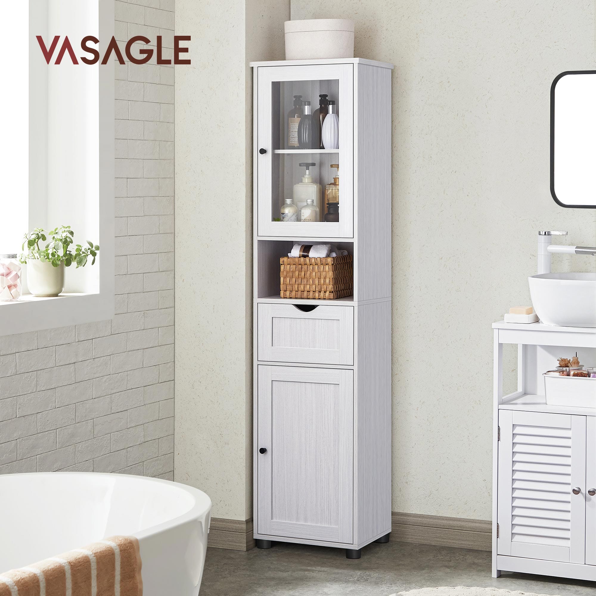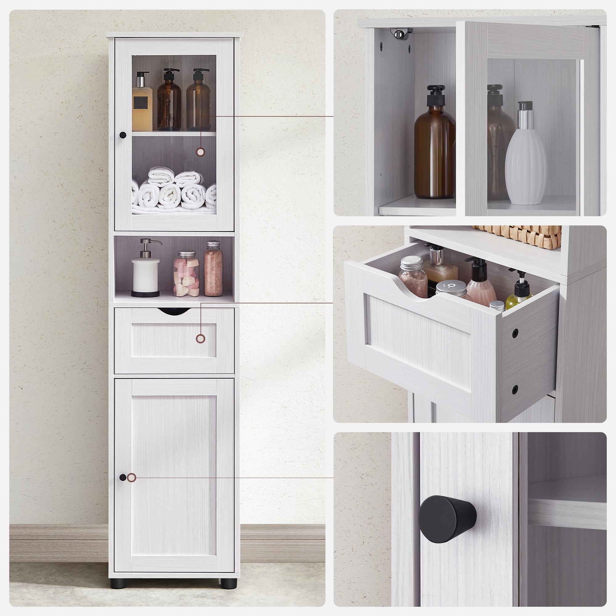 FLERE LAGRE: Dette skab giver dig mulighed for at opbevare ting i forskellige størrelser med et åbent rum til ting, du ofte bruger, en skuffe til håndklæder og justerbare hylder bag dørene. Udstyret med fire vandafvisende plastfødder for bedre stabilitet.
