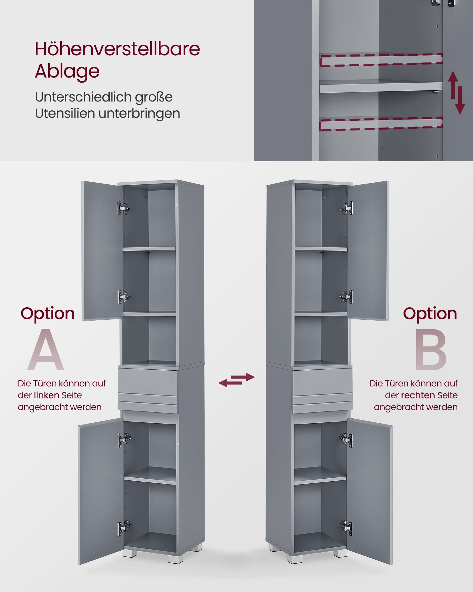 Dette gulvskab er designet med fleksibilitet for øje. Lågerne på hvert skab kan monteres til enten venstre eller højre, hvilket giver dig mulighed for at tilpasse skabet efter dit rums behov. Hylderne bag lågerne er højdejusterbare, så du nemt kan opbevare genstande i forskellige størrelser. Denne fleksibilitet gør skabet ideelt til opbevaring af alt fra håndklæder og toiletartikler til bøger og dekorative genstande.
