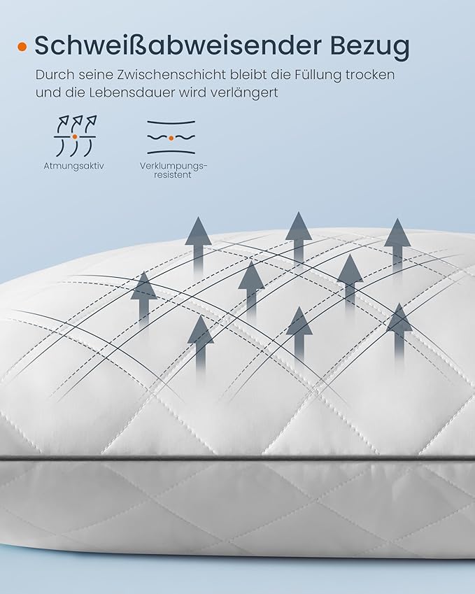 Puden er både elegant og holdbar takket være dens diamant-syninger og forstærkede kanter. Den er udstyret med et innovativt svedresistent betræk, der forhindrer klumper og forlænger pudens levetid. Derudover kan puden maskinvaskes ved op til 60°C, hvilket gør det nemt at holde den ren og frisk, så du kan nyde en hygiejnisk og komfortabel søvn uden besvær.