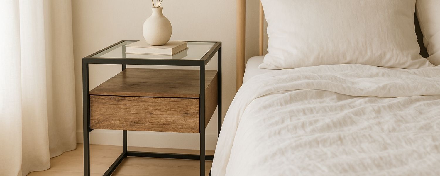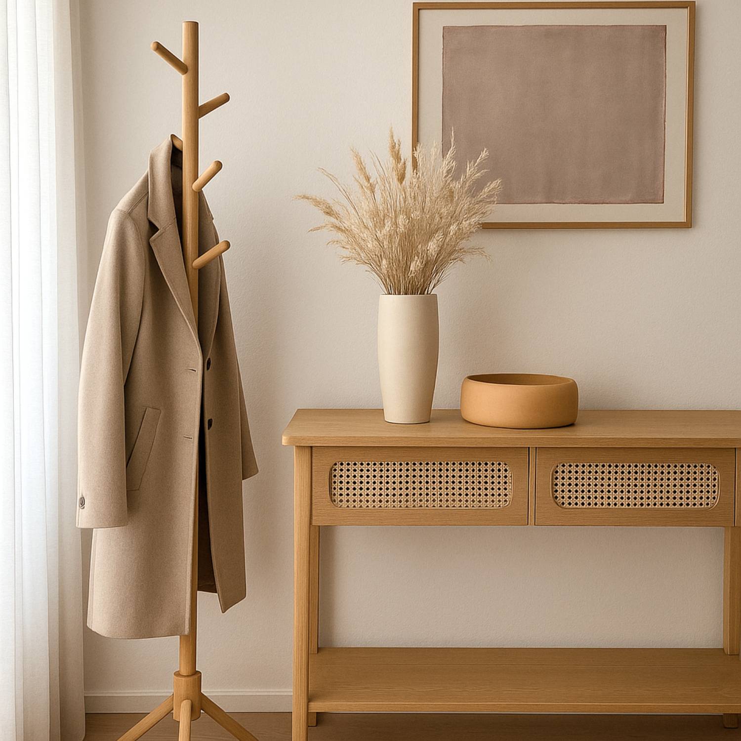 Materialevalget i Japandi design er typisk træ med synlige årer – fx bambus, eg eller mørk valnød. Det giver møblerne varme og karakter, selvom formen er enkel. Skænke, reoler og borde i træ bliver ikke kun praktiske – de bliver en integreret del af rummets atmosfære.