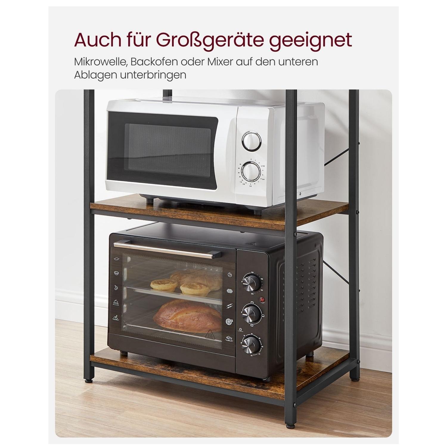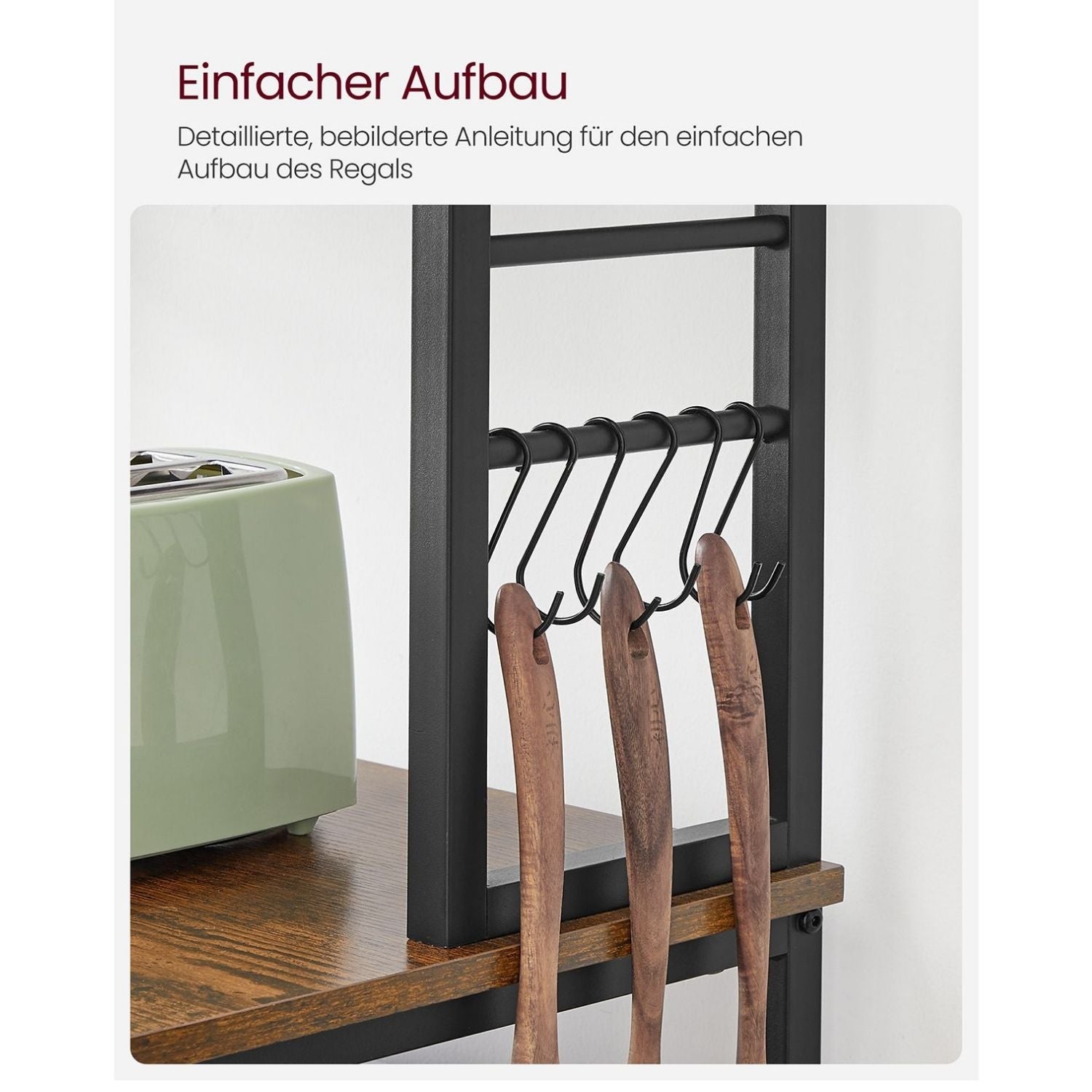 Den midterste hylde på denne køkkenreol kan justeres til to forskellige højder, hvilket giver fleksibilitet til at opbevare forskelligt køkkenudstyr, fra mixere og varmluftfrituregryder til gryder og pander. Dette sikrer, at du altid har det perfekte opbevaringssted for dine køkkenredskaber, uanset størrelse.