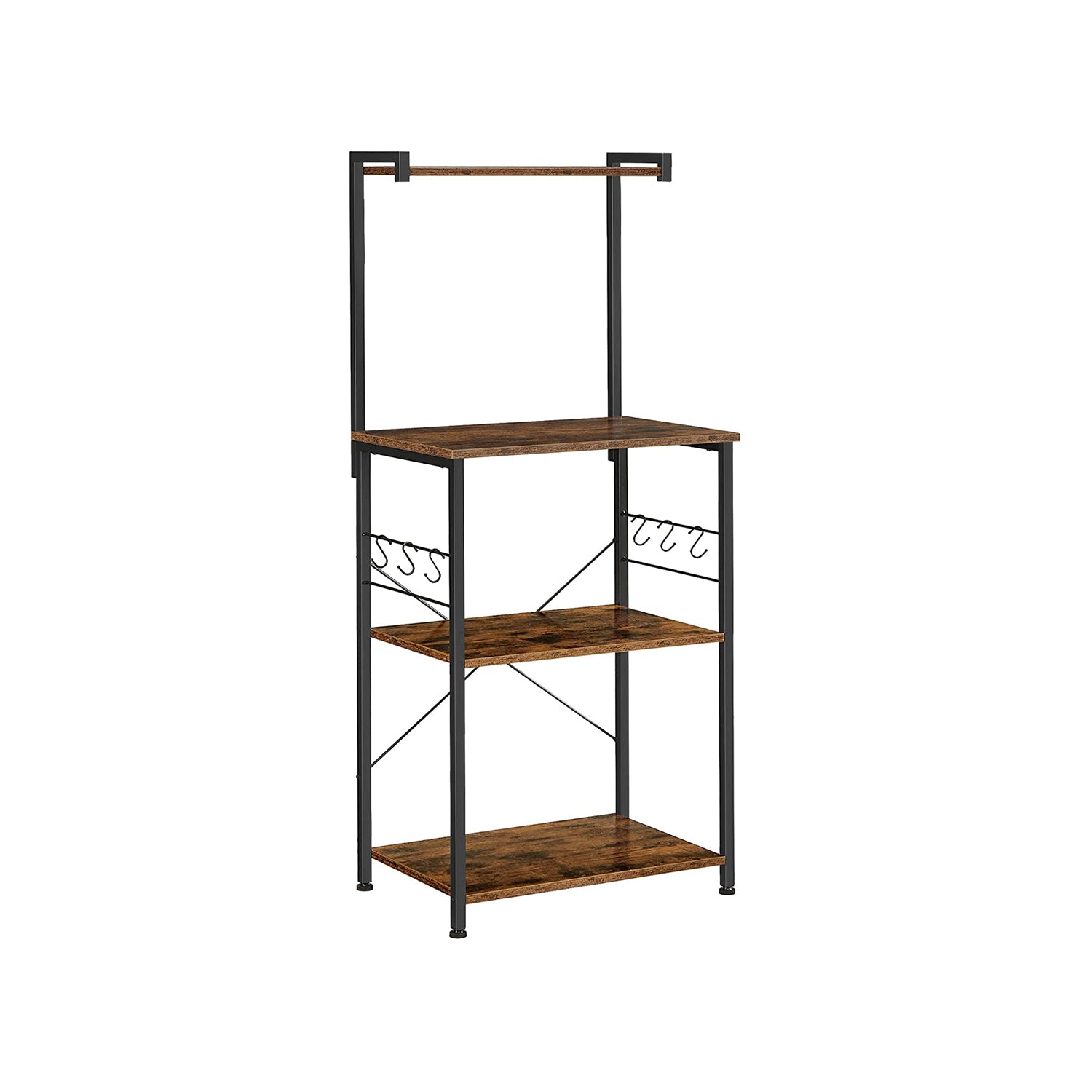 Sig farvel til rod i køkkenet med denne køkkenreol. Med tre rummelige hylder på 60 x 40 cm har du masser af plads til tallerkener, gryder og endda en mikrobølgeovn. De seks medfølgende S-kroge giver en praktisk løsning til at hænge viskestykker og køkkenredskaber op, mens den øverste smalle hylde er perfekt til krydderier.