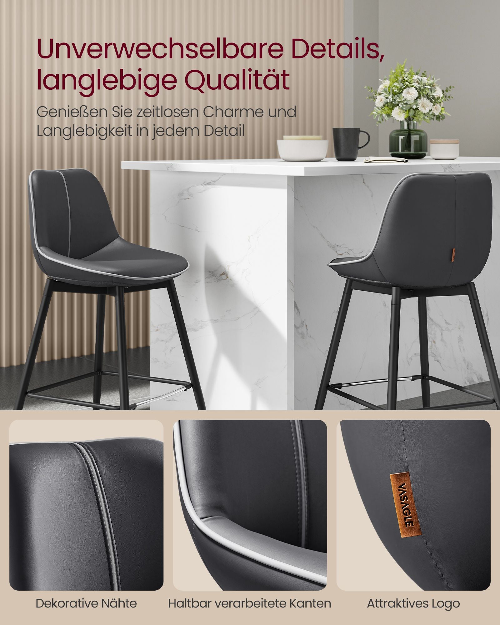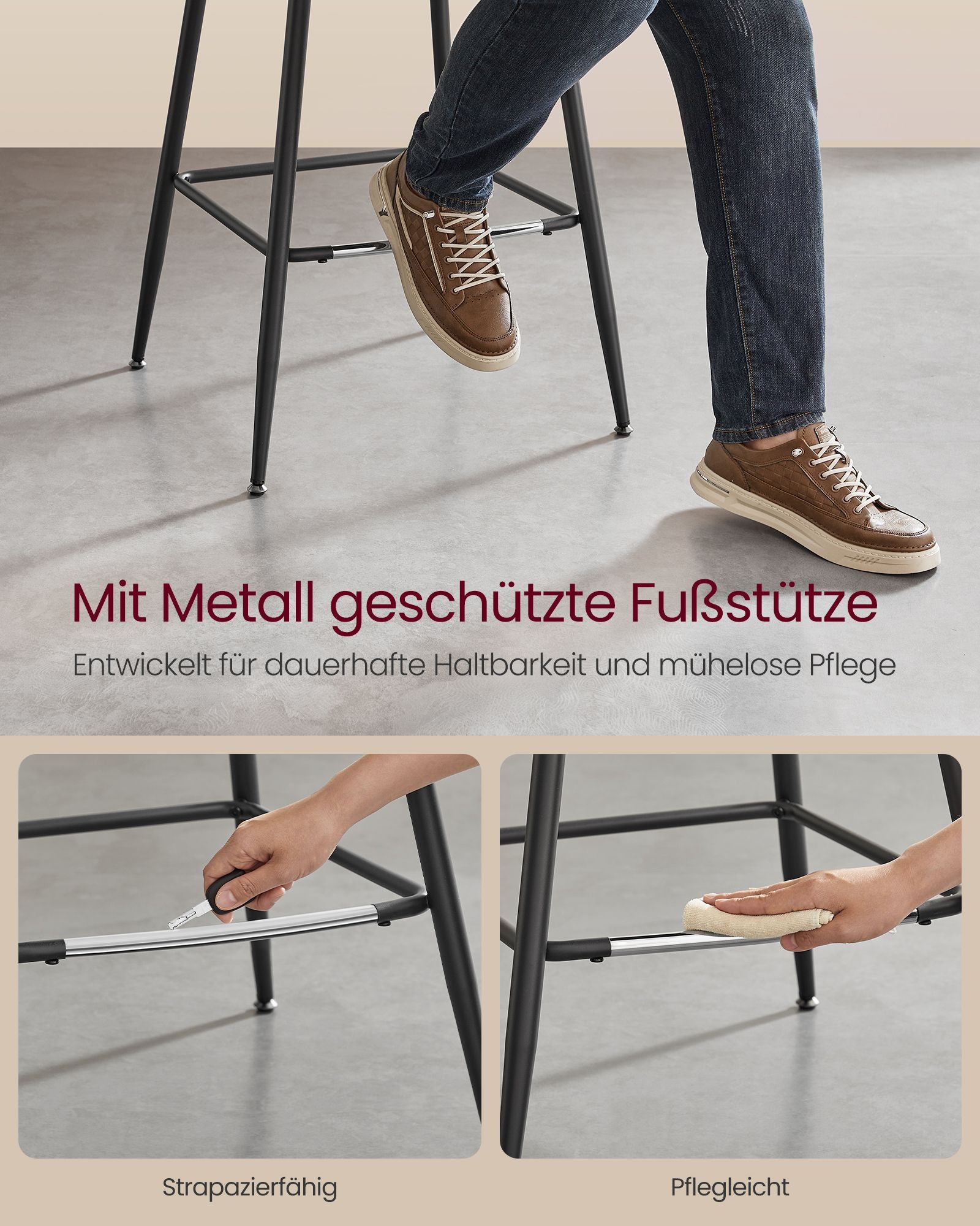 Hver af disse barstole er udstyret med en metalbeskyttet fodstøtte, der sikrer holdbarhed og nem rengøring, selv når der trædes på med sko. Det robuste design giver ekstra støtte, mens du sidder, og tilføjer en praktisk funktion, der gør disse barstole ideelle til daglig brug i hjemmet.