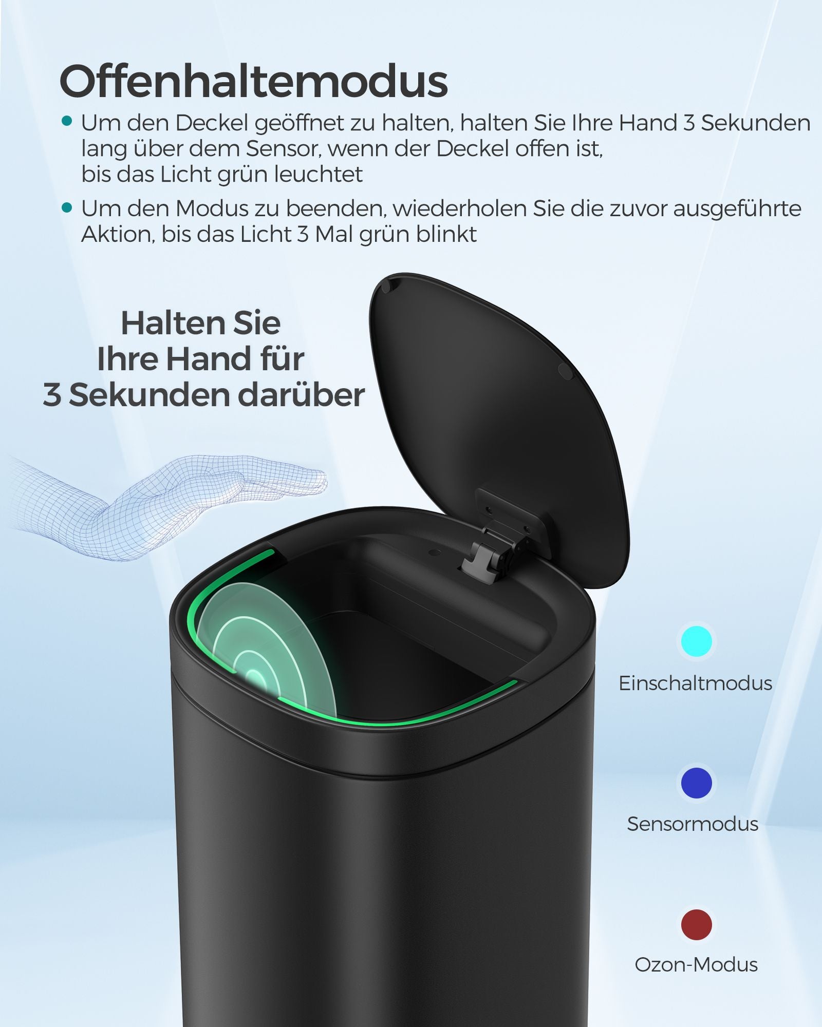 Denne skraldespand tilbyder 4 forskellige arbejdsindstillinger, der let styres via farvede indikatorlamper: Aqua for opstart, Blå for sensor-mode, Grøn for hold-låget åben mode, og Rød for ozon-mode. Disse indikatorer gør det enkelt at vælge den ønskede funktion, så du kan tilpasse affaldshåndteringen efter dine behov.