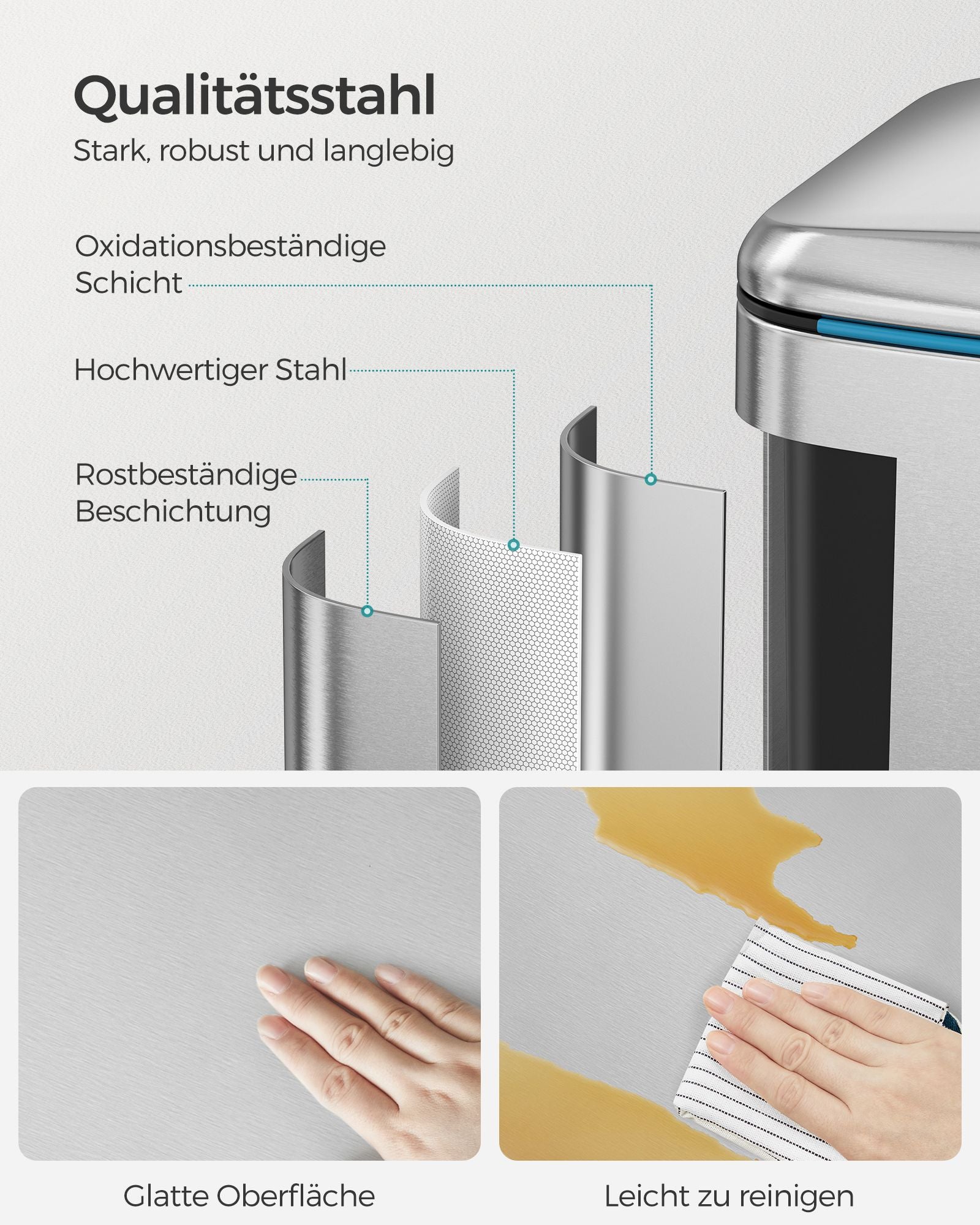Selvom denne affaldsspand er fremstillet af robust metal, har den en blid side. Låget er udstyret med en buffer mekanisme, der sikrer, at det lukker blødt, langsomt og lydløst, uden den forstyrrende lyd af et højt smæk. Det betyder, at du kan opretholde en rolig og behagelig atmosfære i dit køkken, selv når affaldsspanden bruges hyppigt.