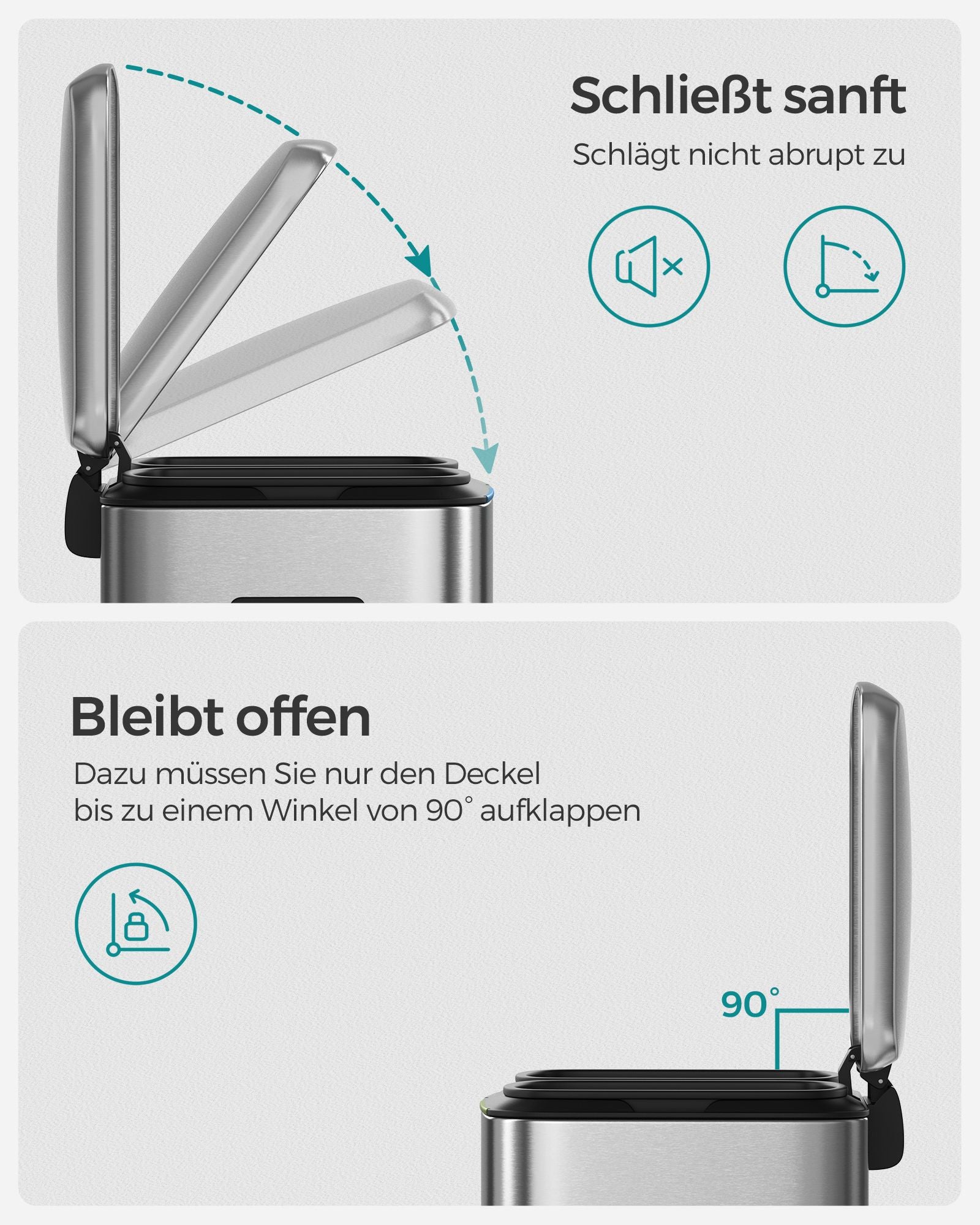 Når du har brug for mere tid til oprydning, såsom efter en stor middag, kan du nemt holde låget åbent ved at løfte det helt tilbage. Når du er færdig, kan du forsigtigt lukke låget med hånden, hvilket hjælper med at holde lugte inde og dit køkken frisk. Denne funktion gør det lettere at håndtere store mængder affald uden stress.