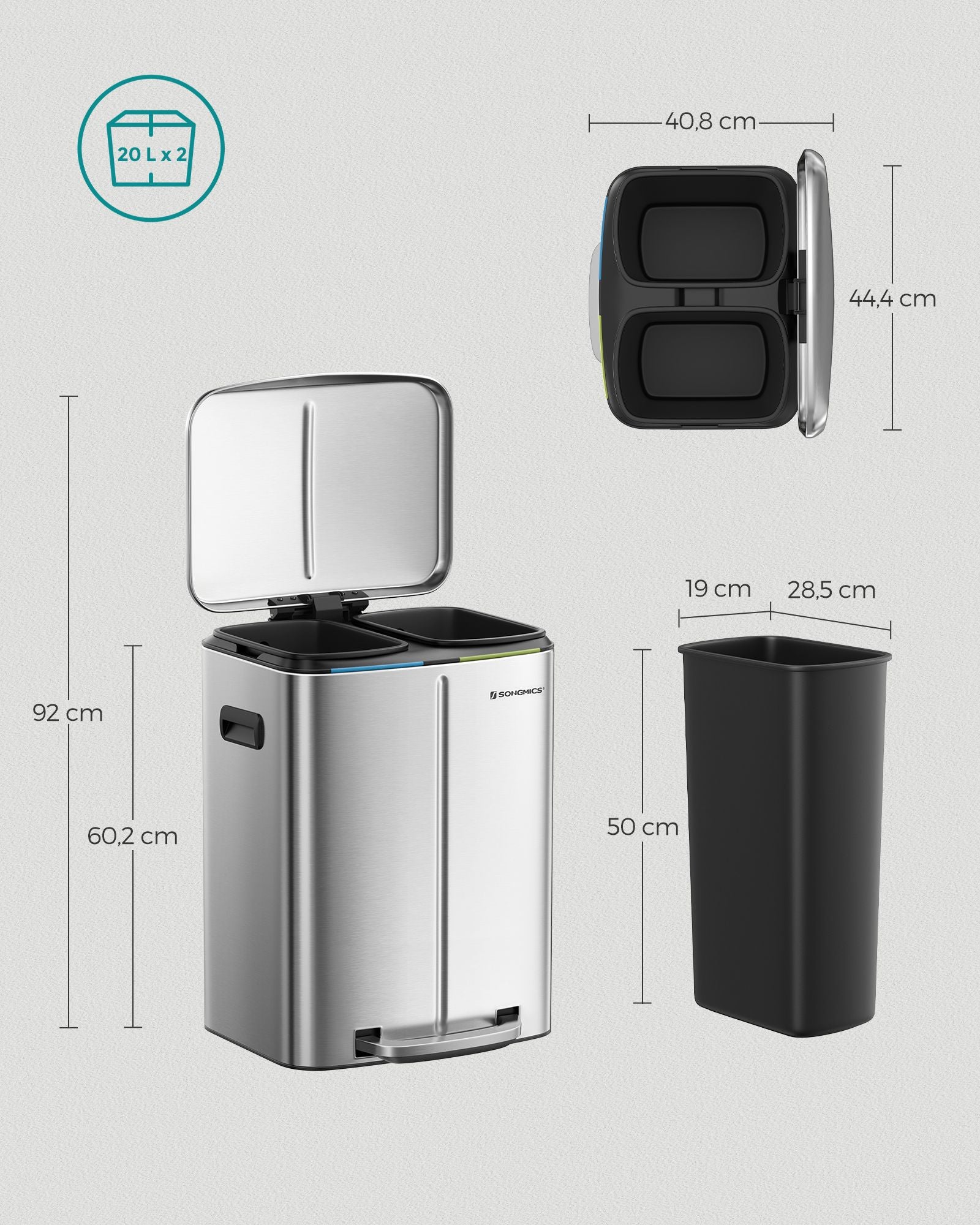 Størrelse på inderbøtte | 40,4 x 27,4 x 58,4 cm (L x B x H) |