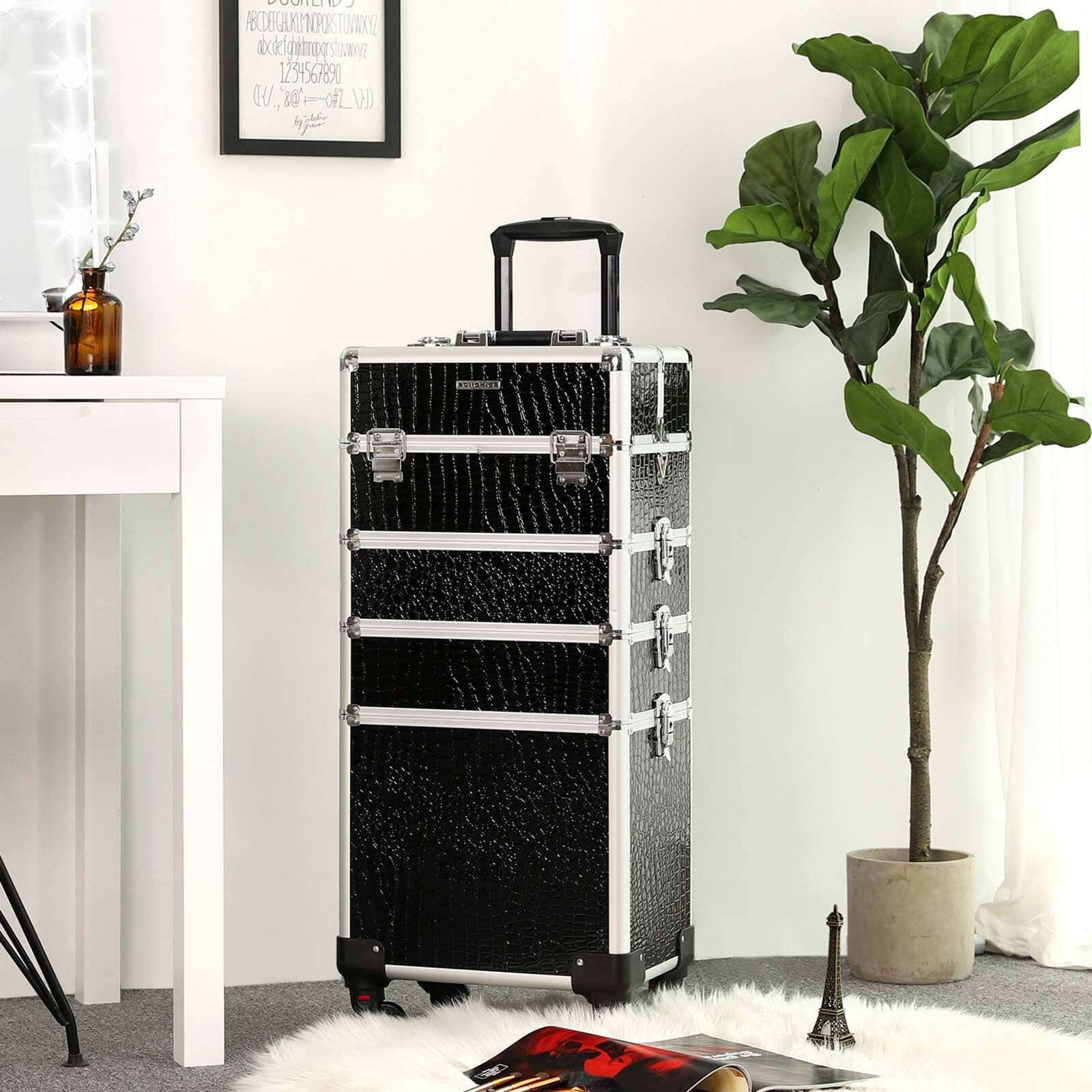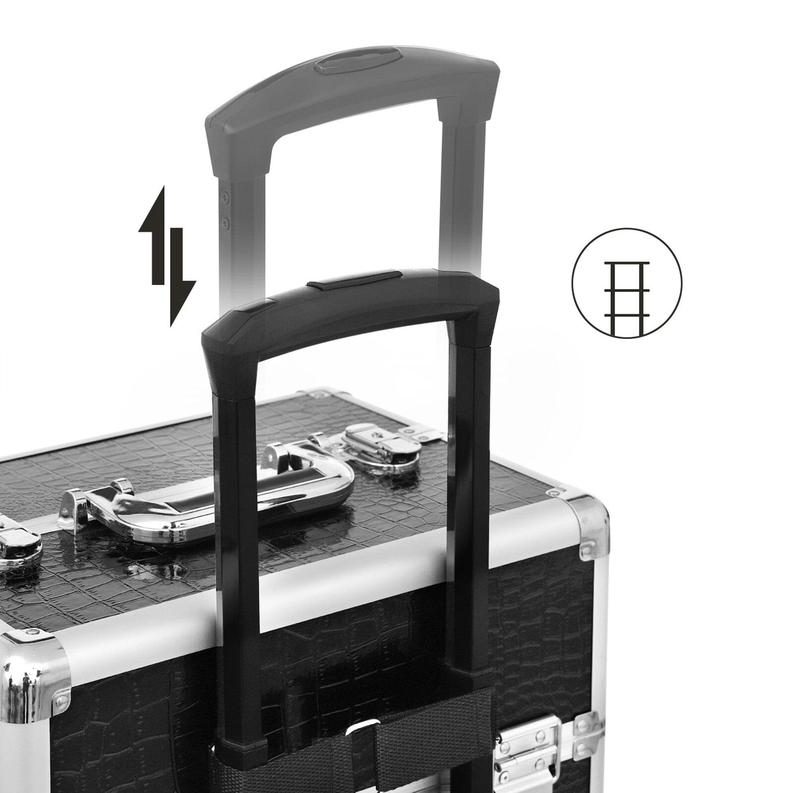 Kroge og sløjfer: Denne Berlin kosmetik taske har en krog og sløjfe på det teleskopiske håndtag for ekstra sikkerhed. MDF-kassen plus sort PU giver den vandtætte egenskaber, hvilket gør den perfekt til sikker opbevaring af din kosmetik.
