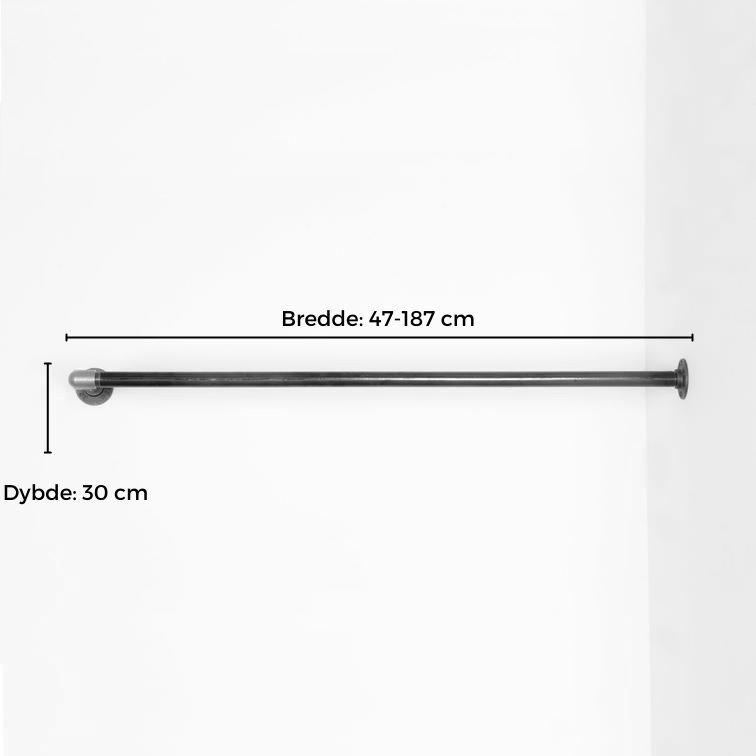Bredde og dybde målet der er oplyst er de komplette bredde på hele ophænget fra ende til ende. Selve bøjlestangen er cirka 7 cm kortere end ophængets komplette bredde.