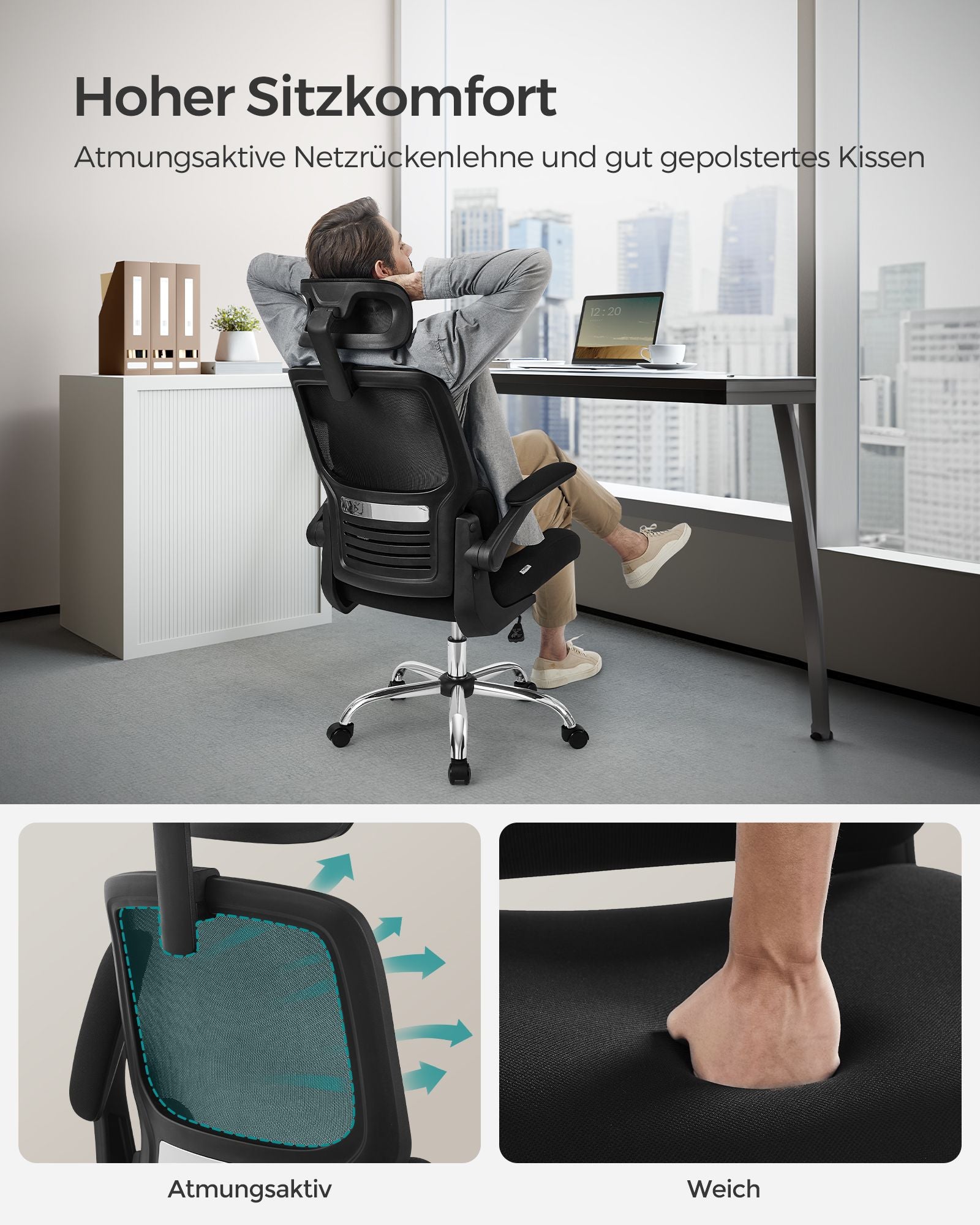 Denne kontorstol er udstyret med en justerbar nakkestøtte, der kan bevæges op og ned med 8 cm og roteres op til 45°. Uanset din højde eller foretrukne siddeposition vil du altid finde den perfekte støtte til din nakke, hvilket gør stolen ideel til både arbejde og afslapning.