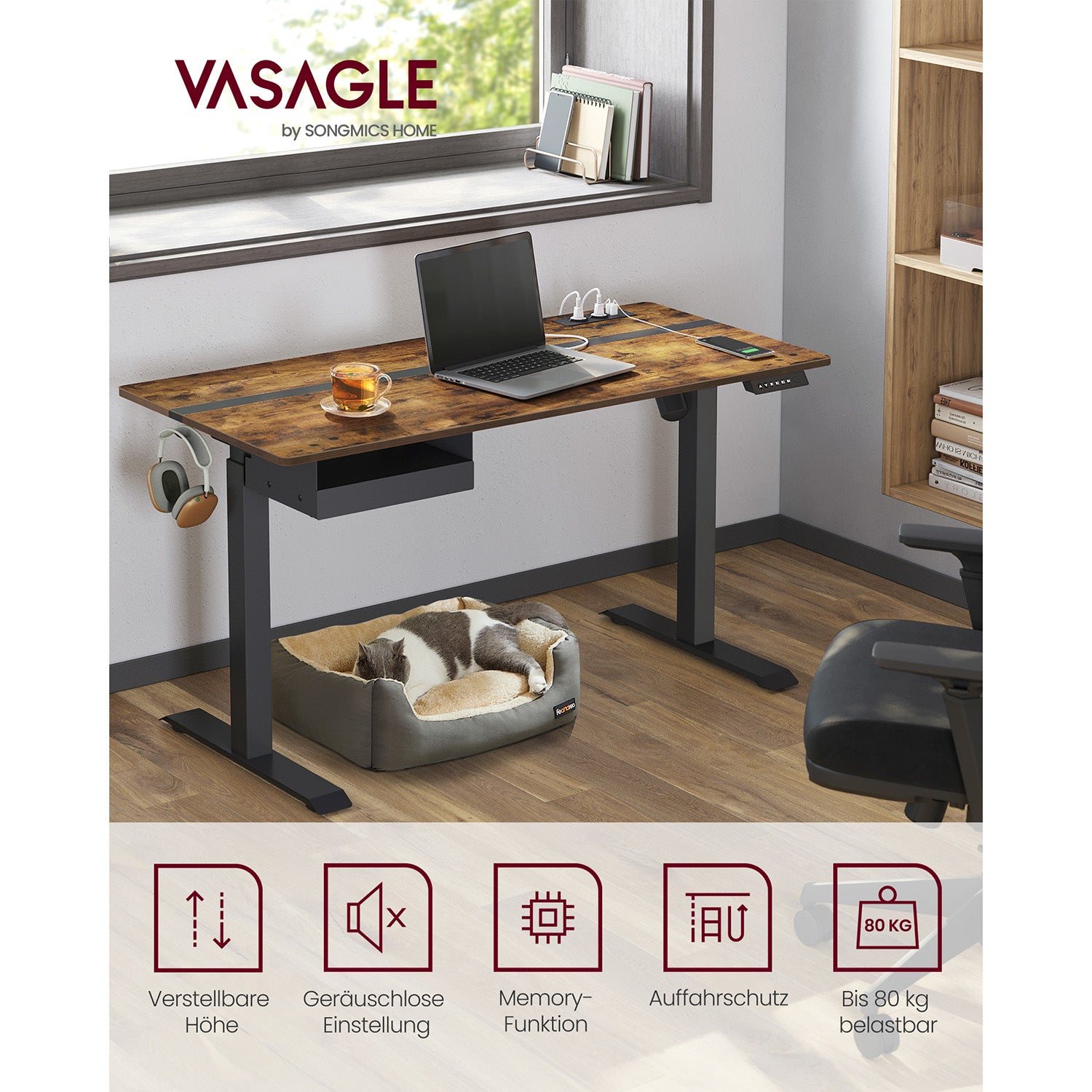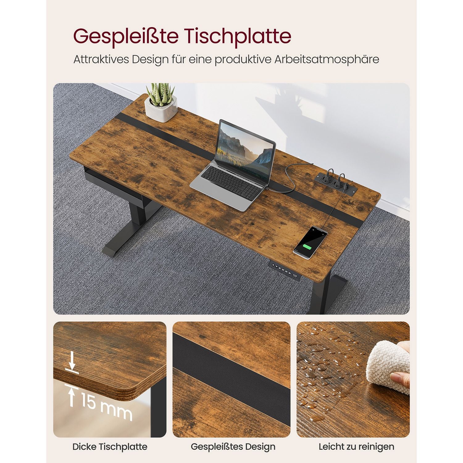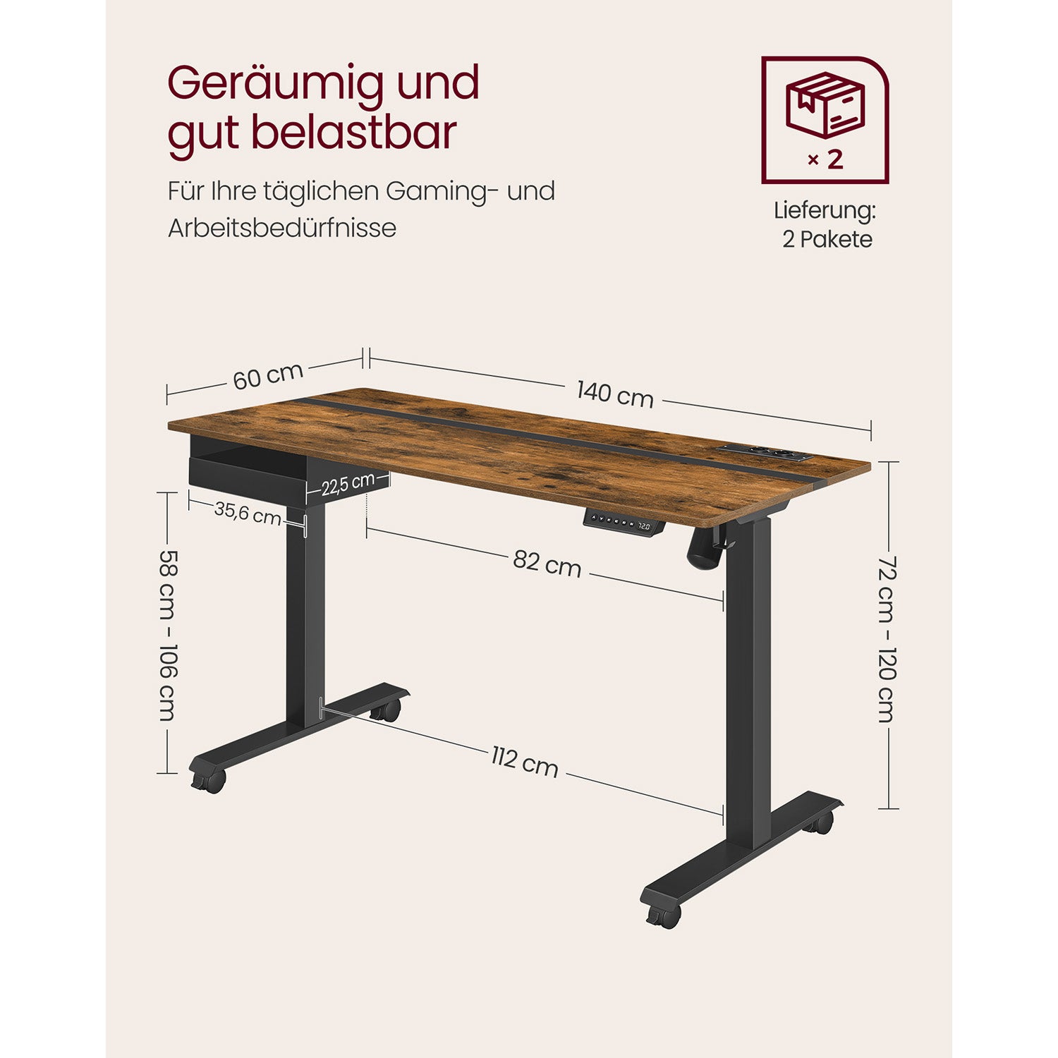 Skrivebordet har en smart indbygget stikkontakt med to opladningskontakter og to USB-porte, hvilket gør det muligt at oplade dine enheder samtidig med, at du driver motoren. Den spaltede bordplade med forskellige farver tilføjer stil til dit rum, mens den lille skuffe (22,7 x 32,5 x 4,0 cm) giver plads til kontorartikler. Den tilhørende krog på siden er ideel til at hænge hovedtelefoner eller tasker, hvilket hjælper med at holde dit arbejdsområde ryddeligt.