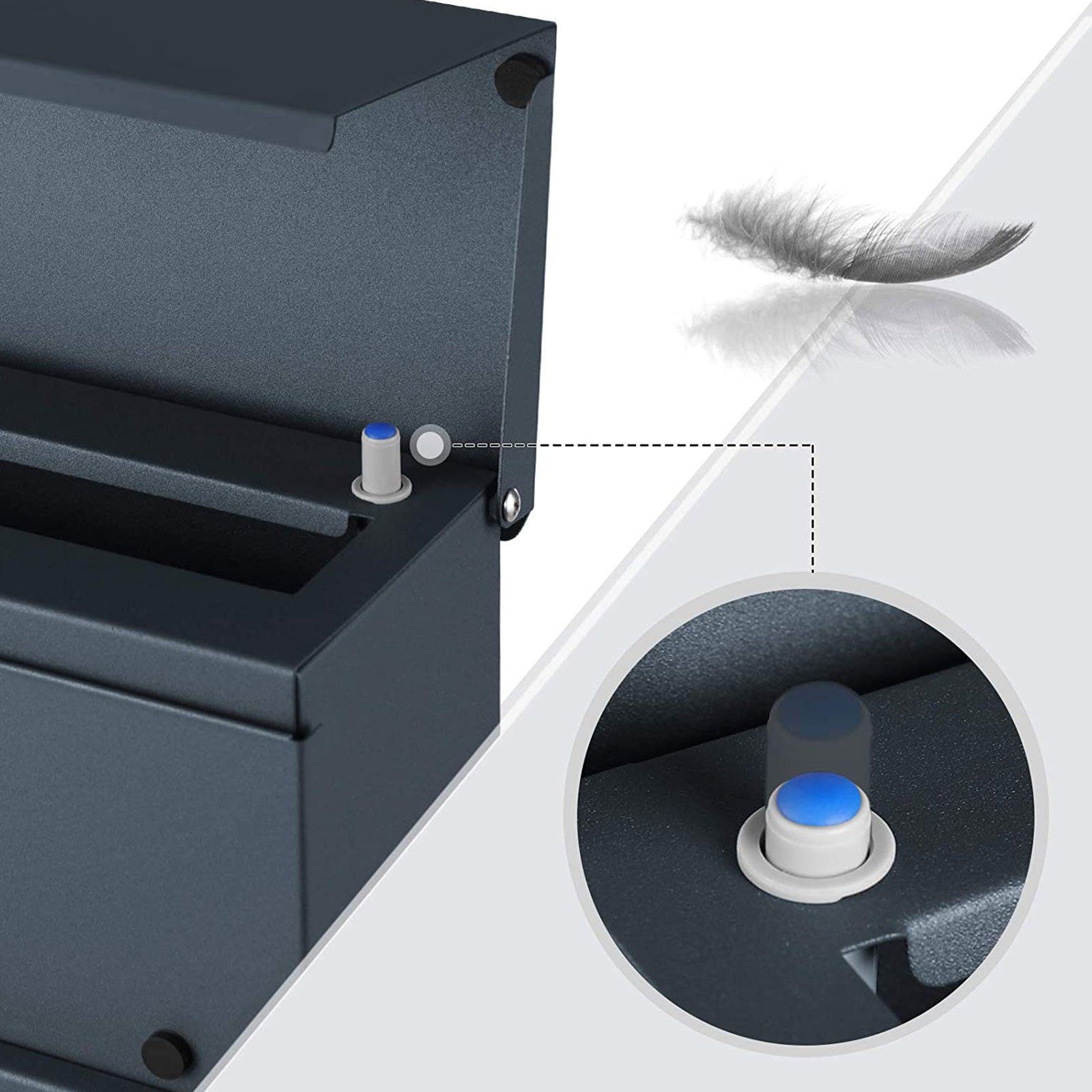 Denne postkasse kombinerer geometriske elementer og slanke linjer med en antracitgrå belægning, der tilføjer et moderne præg til din indgang. Det blødt-lukkende låg sørger for stille levering uden støj, selv efter postmanden har været forbi.
