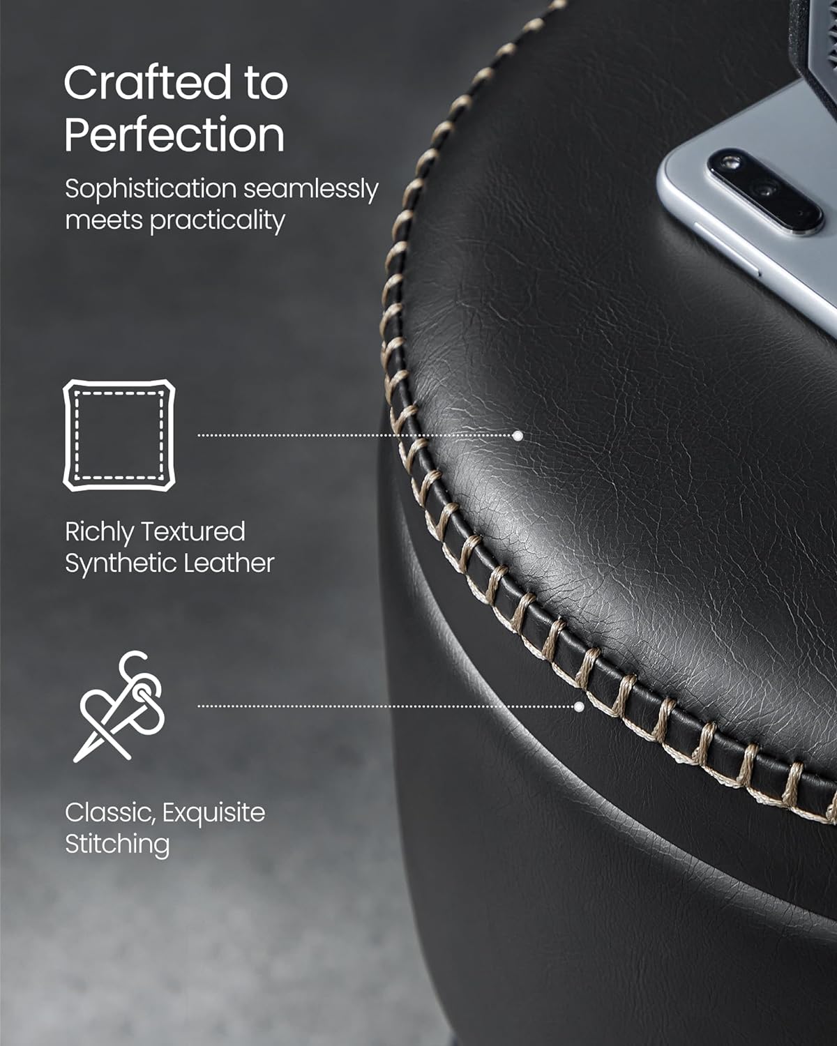 Oplev sammenblandingen af syntetisk læder, forfinet syning og slanke koniske ben i opbevaringspuffen - en håndgribelig hyldest til håndværksånden, der hæver dit hjem til nye højder af sofistikation.