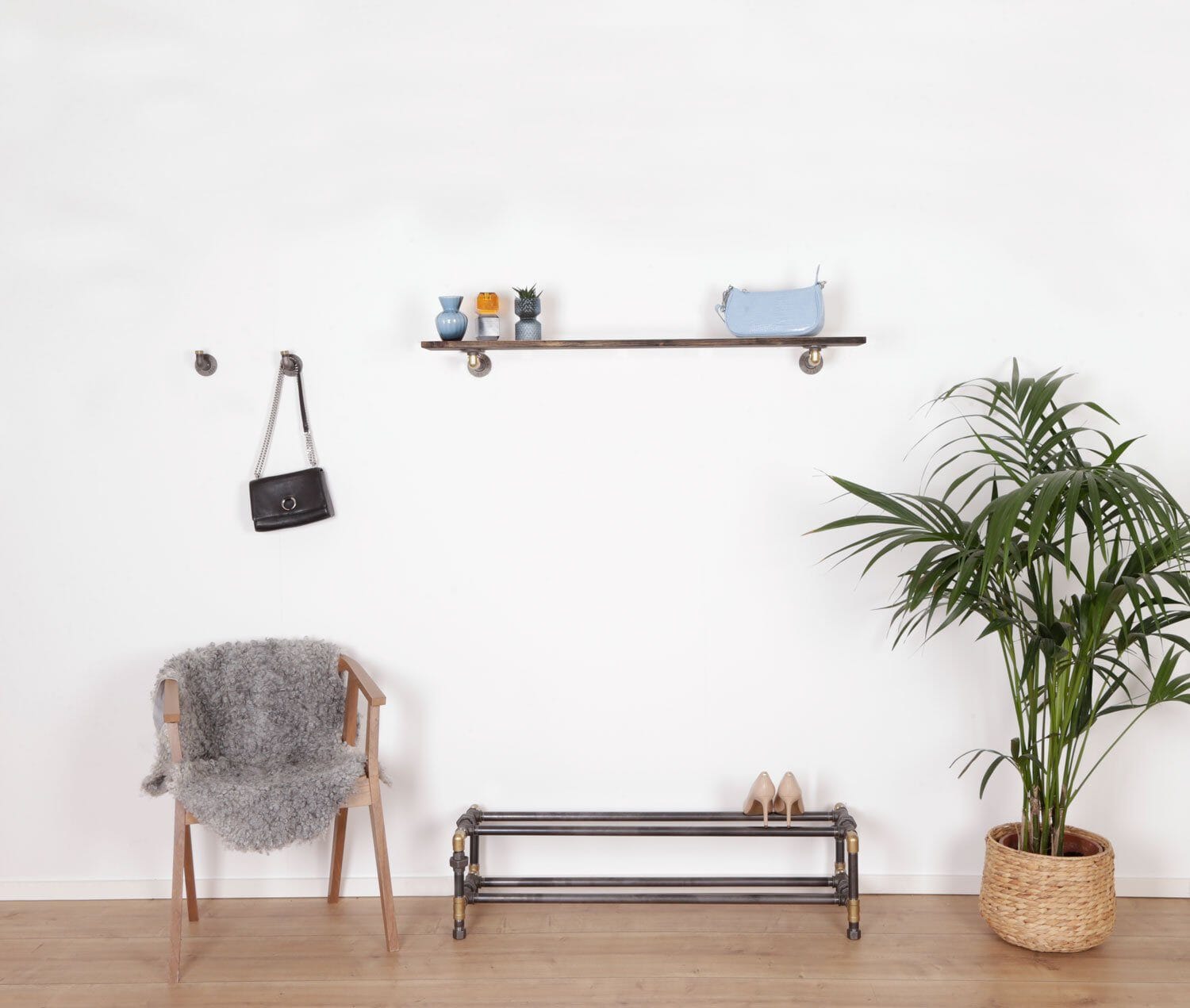 Denne træhylde til væg giver dig muligheden for at udtrykke din egen stil og tilpasse dit rum efter dine præferencer. Med kombinationen af sort med messing metal, træets varme nuancer og muligheden for at udvide med rør, er dette mere end bare en hylde - det er et kunstnerisk statement. Skab et personligt og unikt udtryk, der fortæller din historie.