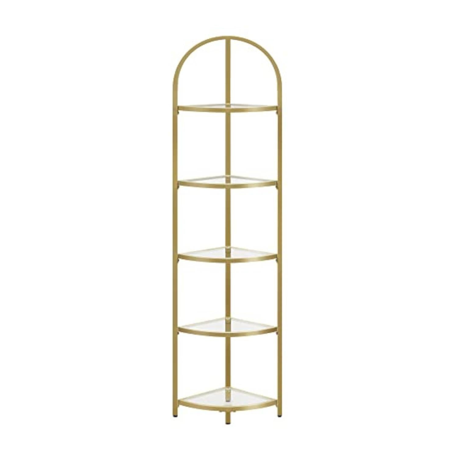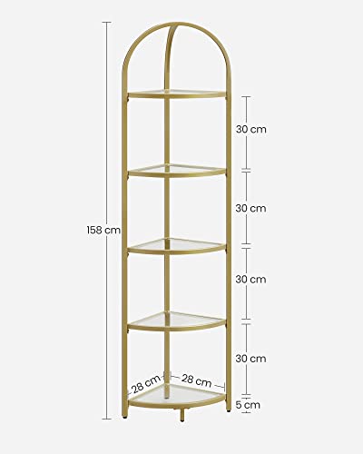 Med sit stilfulde design, glashylder og gyldne ramme tilføjer denne moderne hjørnehylde et strejf af glamour til dit rum. Fremhæv dine interesser og vis selvudtryk med denne moderne hjørnehylde!
