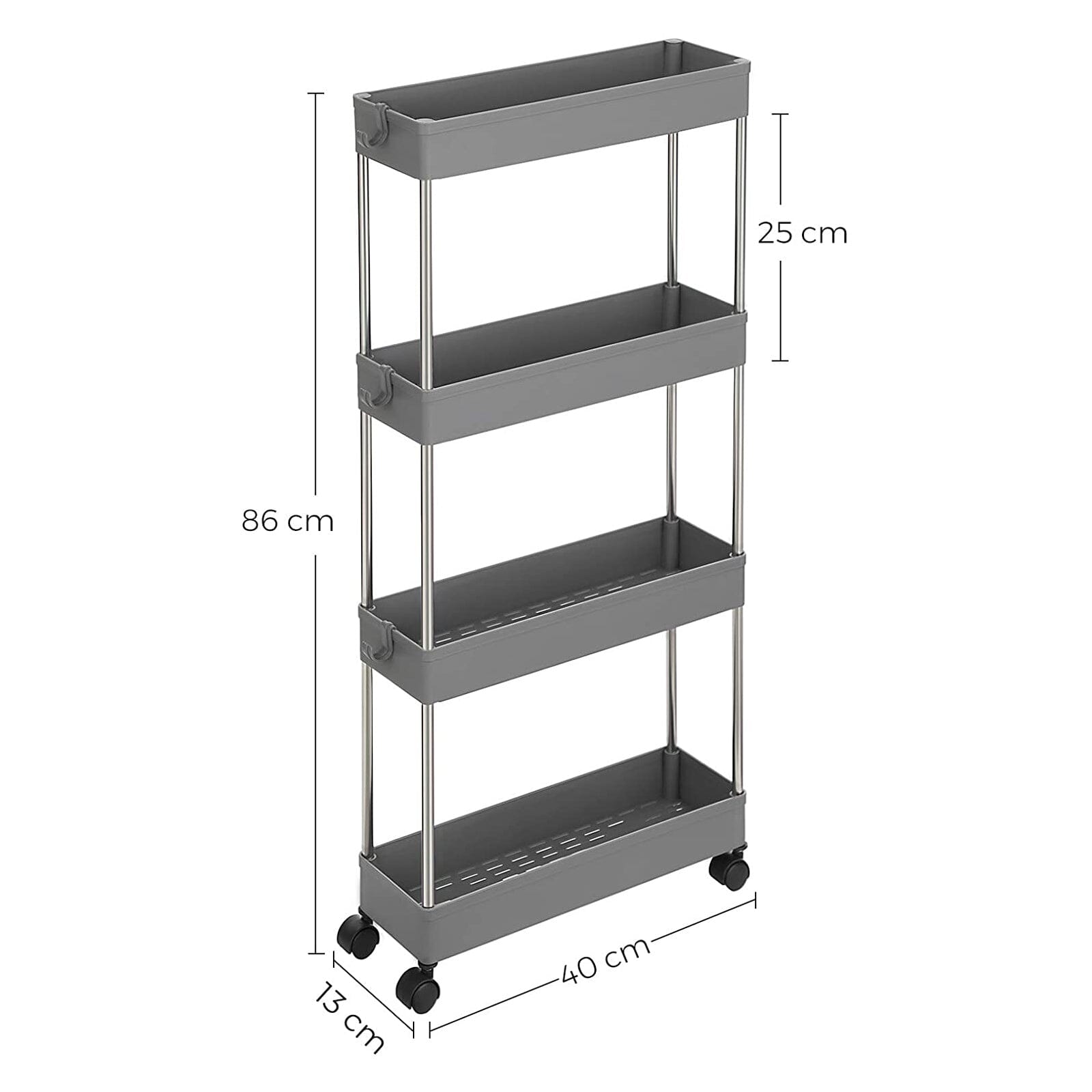Opgrader hvert eneste hjørne: Denne vogn med 4 hjul er den perfekte opbevaringsløsning for dem, der ønsker at få mest muligt ud af deres begrænsede plads - med en dybde på kun 12,5 cm kan den passe ind i ethvert hjørne! Desuden kan den robuste metalramme og hylderne i PP-plast bære op til 20 kg i alt.