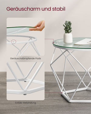 Bordene er konstrueret med hærdet glas og en robust stålramme, hvilket sikrer en stabil konstruktion. Hvert lille bord kan bære op til 20 kg, så du kan placere dine yndlingsdrikke og dekorationer uden frygt for vuggen. Det holdbare design garanterer, at bordene forbliver stabile og funktionelle i mange år.