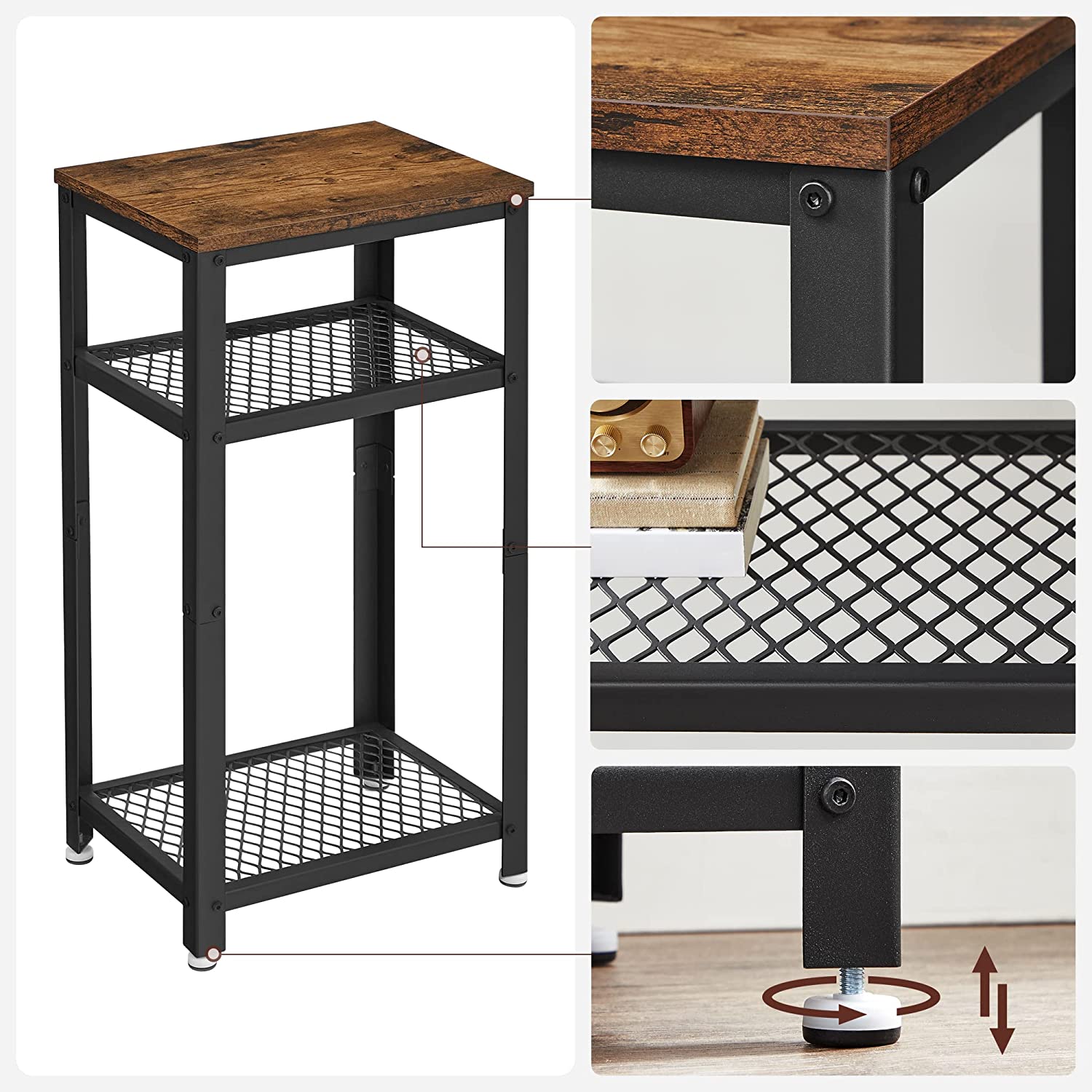 Dette 3-lags sidebord kombinerer rustikt konstrueret træ med metalhylder og en solid stålramme for at skabe et tidløst og funktionelt møbel. Placer en lampe øverst, fjernbetjeninger på den midterste hylde, og bøger på den nederste – og lad dette bord arbejde for dig. Hver hylde kan bære op til 10 kg, hvilket giver dig rigelig plads til dekorationer eller personlige ejendele.
